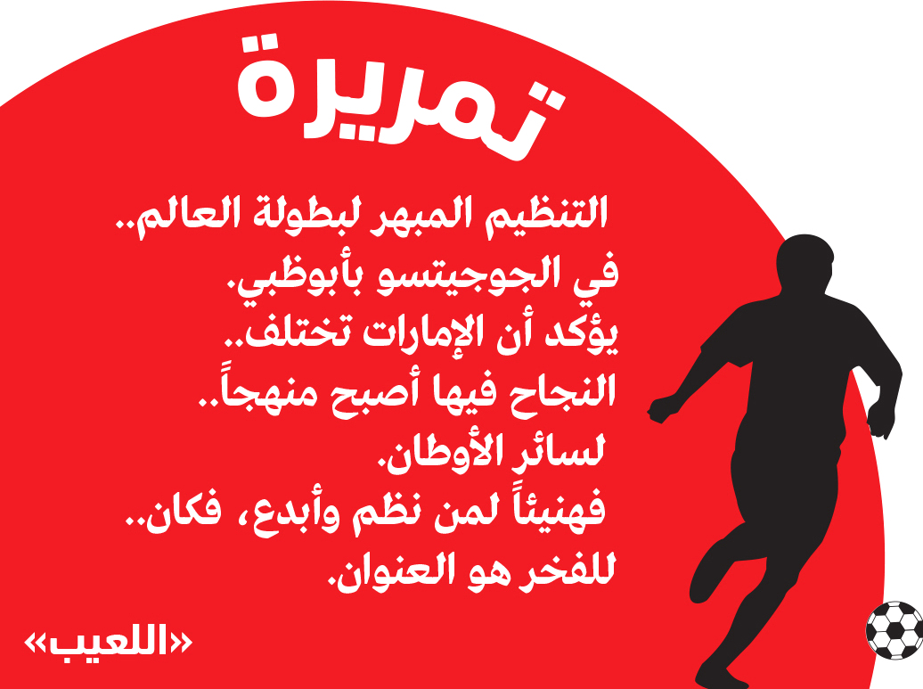 الفخرالتنظيم المبهر لبطولة العالم.. في الجوجيتسو بأبوظبي. يؤكد أن الإمارات تختلف.. النجاح فيها أصبح منهجاً.. لسائر الأوطان. فهنيئاً لمن نظم وأبدع، فكان.. للفخر هو العنوان.