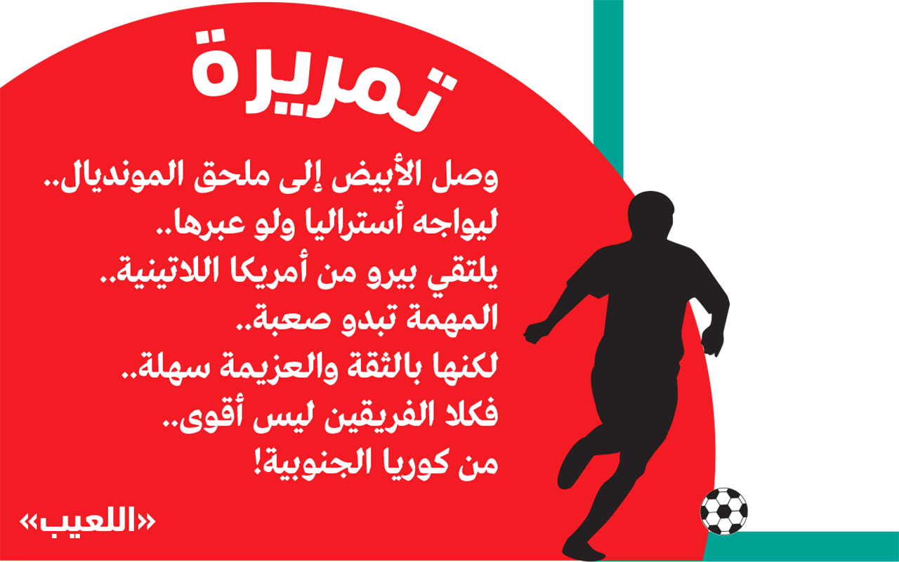 الأبيض وملحق المونديال..بالثقة والعزيمة سهلةتمريرةوصل الأبيض إلى ملحق المونديال.. ليواجه أستراليا ولو عبرها.. يلتقي بيرو من أمريكا اللاتينية.. المهمة تبدو صعبة.. لكنها بالثقة والعزيمة سهلة.. فكلا الفريقين ليس أقوى.. من كوريا الجنوبية! "اللعيب"