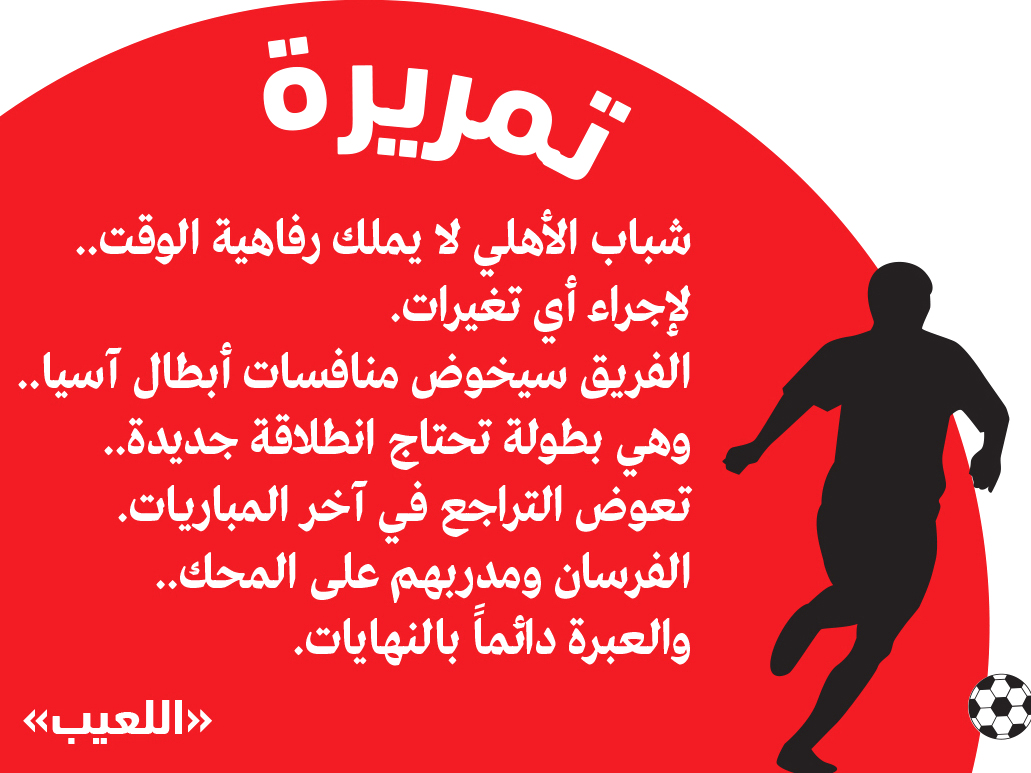 العبرة بالنهاياتشباب الأهلي لا يملك رفاهية الوقت.. لإجراء أي تغيرات. الفريق سيخوض منافسات أبطال آسيا.. وهي بطولة تحتاج انطلاقة جديدة.. تعوض التراجع في آخر المباريات. الفرسان ومدربهم على المحك.. والعبرة دائماً بالنهايات.