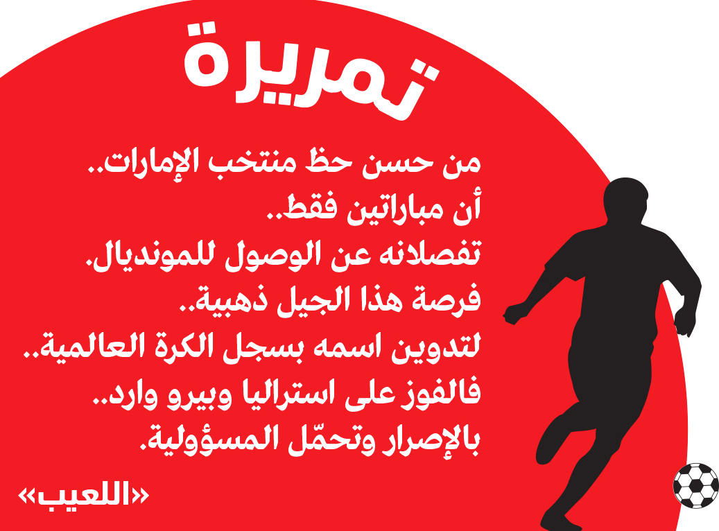 الوصول للمونديالمن حسن حظ منتخب الإمارات.. أن مباراتين فقط.. تفصلانه عن الوصول للمونديال. فرصة هذا الجيل ذهبية.. لتدوين اسمه بسجل الكرة العالمية.. فالفوز على استراليا وبيرو وارد.. بالإصرار وتحمّل المسؤولية.
