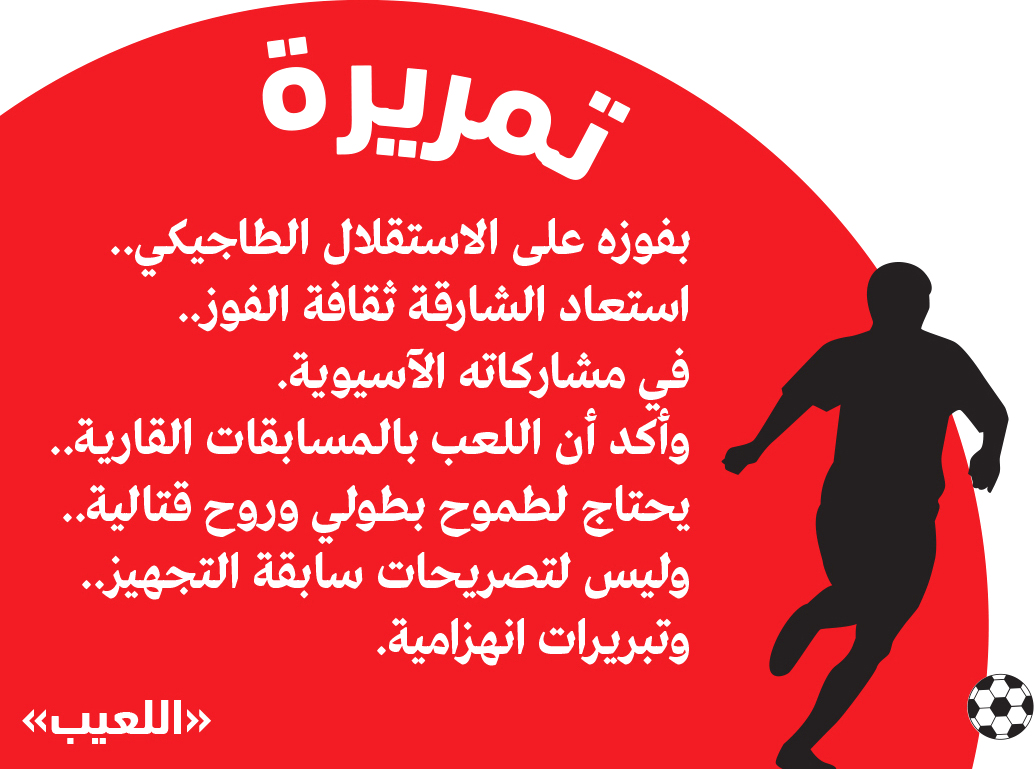 المسابقات القاريةبفوزه على الاستقلال الطاجيكي.. استعاد الشارقة ثقافة الفوز.. في مشاركاته الآسيوية. وأكد أن اللعب بالمسابقات القارية.. يحتاج لطموح بطولي وروح قتالية.. وليس لتصريحات سابقة التجهيز.. وتبريرات انهزامية.
