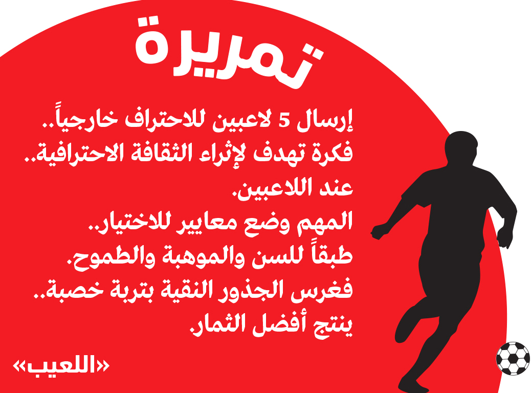الثقافة الاحترافيةإرسال 5 لاعبين للاحتراف خارجياً.. فكرة تهدف لإثراء الثقافة الاحترافية.. عند اللاعبين. المهم وضع معايير للاختيار.. طبقاً للسن والموهبة والطموح. فغرس الجذور النقية بتربة خصبة.. ينتج أفضل الثمار.