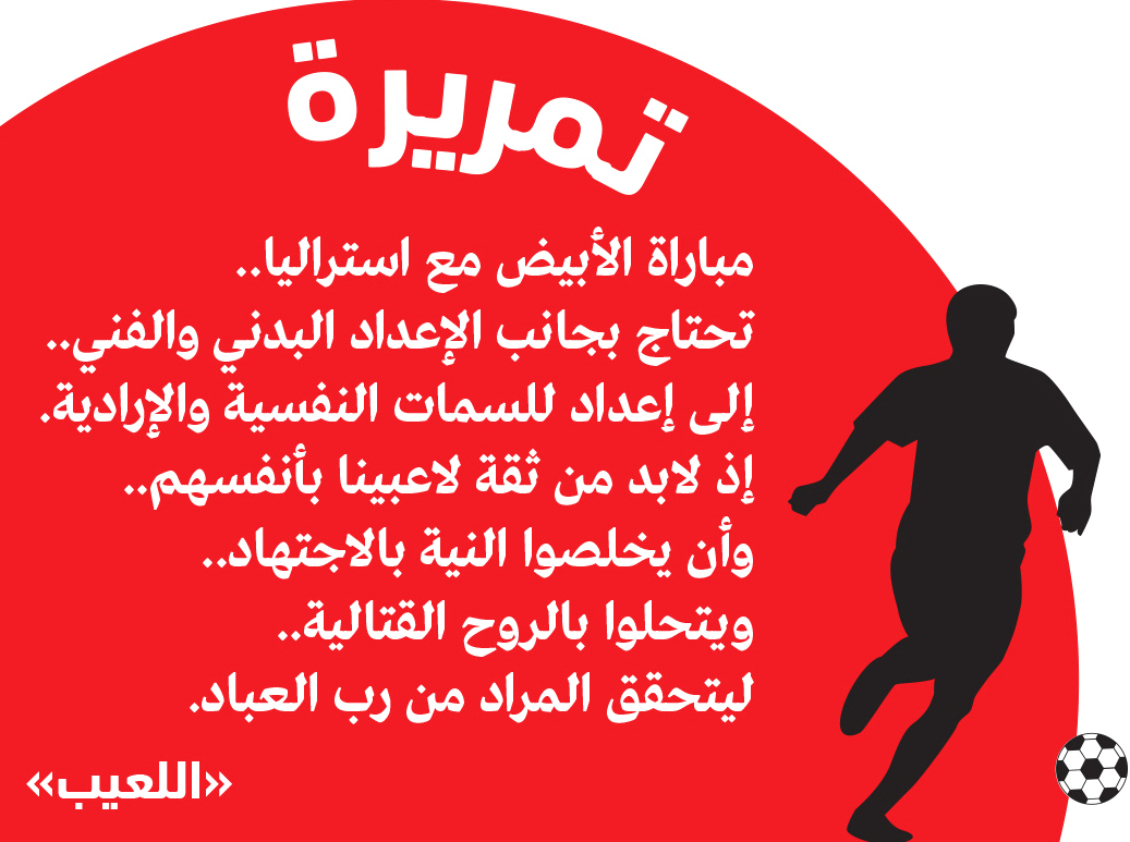 الروح القتاليةمباراة الأبيض مع استراليا.. تحتاج بجانب الإعداد البدني والفني.. إلى إعداد للسمات النفسية والإرادية. إذ لابد من ثقة لاعبينا بأنفسهم.. وأن يخلصوا النية بالاجتهاد.. ويتحلوا بالروح القتالية.. ليتحقق المراد من رب العباد.