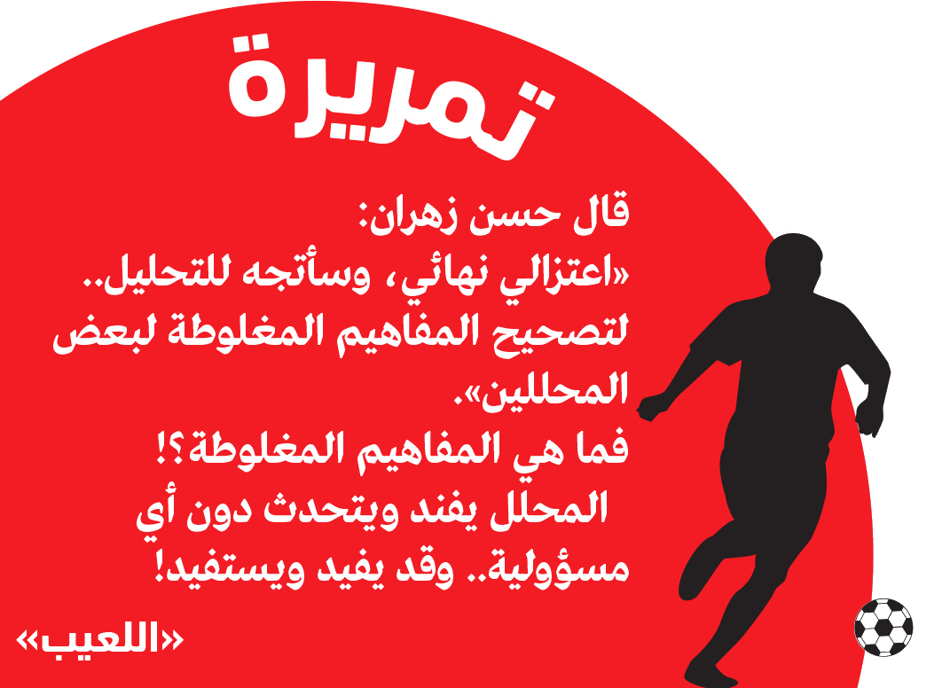 قد يفيد ويستفيد!قال حسن زهران: «اعتزالي نهائي، وسأتجه للتحليل.. لتصحيح المفاهيم المغلوطة لبعض المحللين». فما هي المفاهيم المغلوطة؟! المحلل يفند ويتحدث دون أي مسؤولية.. وقد يفيد ويستفيد!