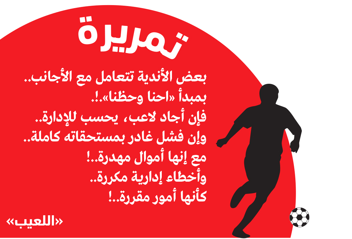 «احنا وحظنا».!.بعض الأندية تتعامل مع الأجانب.. بمبدأ «احنا وحظنا».!. فإن أجاد لاعب، يحسب للإدارة.. وإن فشل غادر بمستحقاته كاملة.. مع إنها أموال مهدرة..! وأخطاء إدارية مكررة.. كأنها أمور مقررة..!