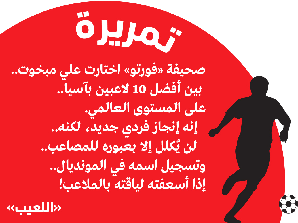 أفضل 10 لاعبين بآسياصحيفة «فورتو» اختارت علي مبخوت.. بين أفضل 10 لاعبين بآسيا.. على المستوى العالمي. إنه إنجاز فردي جديد، لكنه.. لن يُكلل إلا بعبوره للمصاعب.. وتسجيل اسمه في المونديال.. إذا أسعفته لياقته بالملاعب!