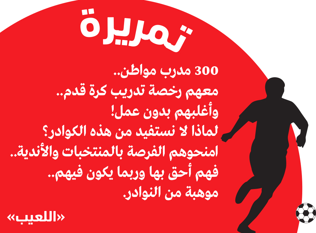 300 مدرب مواطن300 مدرب مواطن.. معهم رخصة تدريب كرة قدم.. وأغلبهم بدون عمل! لماذا لا نستفيد من هذه الكوادر؟ امنحوهم الفرصة بالمنتخبات والأندية.. فهم أحق بها وربما يكون فيهم.. موهبة من النوادر.