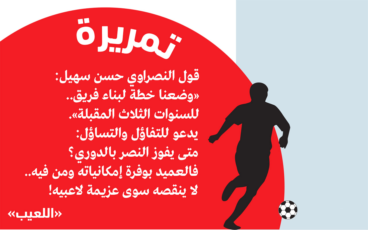 متى يفوز النصر بالدوري؟تمريرةقول النصراوي حسن سهيل: «وضعنا خطة لبناء فريق.. للسنوات الثلاث المقبلة». يدعو للتفاؤل والتساؤل: متى يفوز النصر بالدوري؟ فالعميد بوفرة إمكانياته ومن فيه.. لا ينقصه سوى عزيمة لاعبيه! "اللعيب"