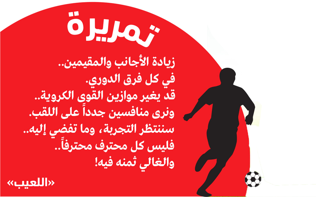 ليس كل محترف محترفاً..تمريرةزيادة الأجانب والمقيمين.. في كل فرق الدوري. قد يغير موازين القوى الكروية.. ونرى منافسين جدداً على اللقب. سننتظر التجربة، وما تفضي إليه.. فليس كل محترف محترفاً.. والغالي ثمنه فيه! "اللعيب"