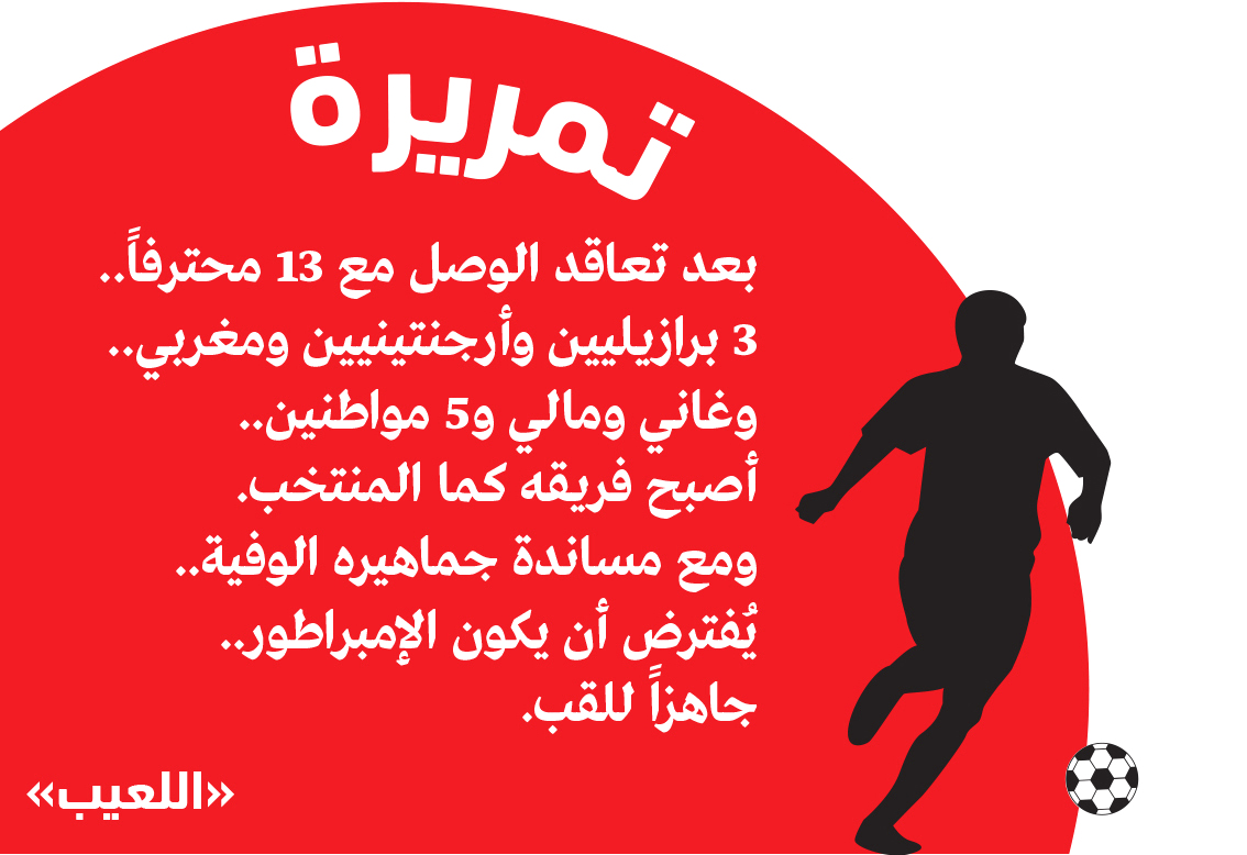 الإمبراطوربعد تعاقد الوصل مع 13 محترفاً.. 3 برازيليين وأرجنتينيين ومغربي.. وغاني ومالي و5 مواطنين.. أصبح فريقه كما المنتخب. ومع مساندة جماهيره الوفية.. يُفترض أن يكون الإمبراطور.. جاهزاً للقب.