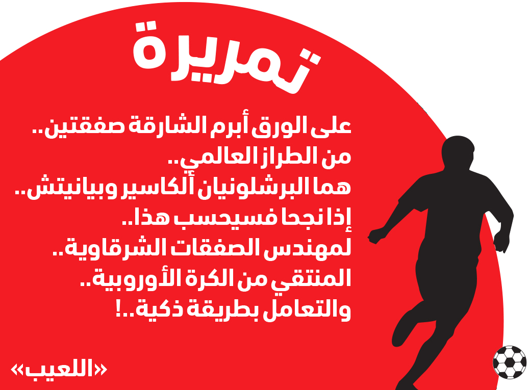على الورقعلى الورق أبرم الشارقة صفقتين.. من الطراز العالمي.. هما البرشلونيان ألكاسير وبيانيتش.. إذا نجحا فسيحسب هذا.. لمهندس الصفقات الشرقاوية.. المنتقي من الكرة الأوروبية.. والتعامل بطريقة ذكية..!