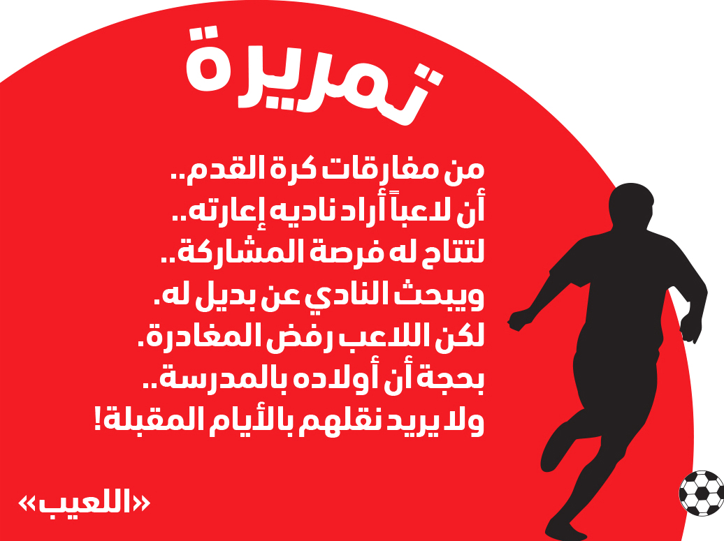 من مفارقات كرة القدممن مفارقات كرة القدم.. أن لاعباً أراد ناديه إعارته.. لتتاح له فرصة المشاركة.. ويبحث النادي عن بديل له. لكن اللاعب رفض المغادرة. بحجة أن أولاده بالمدرسة.. ولا يريد نقلهم بالأيام المقبلة!