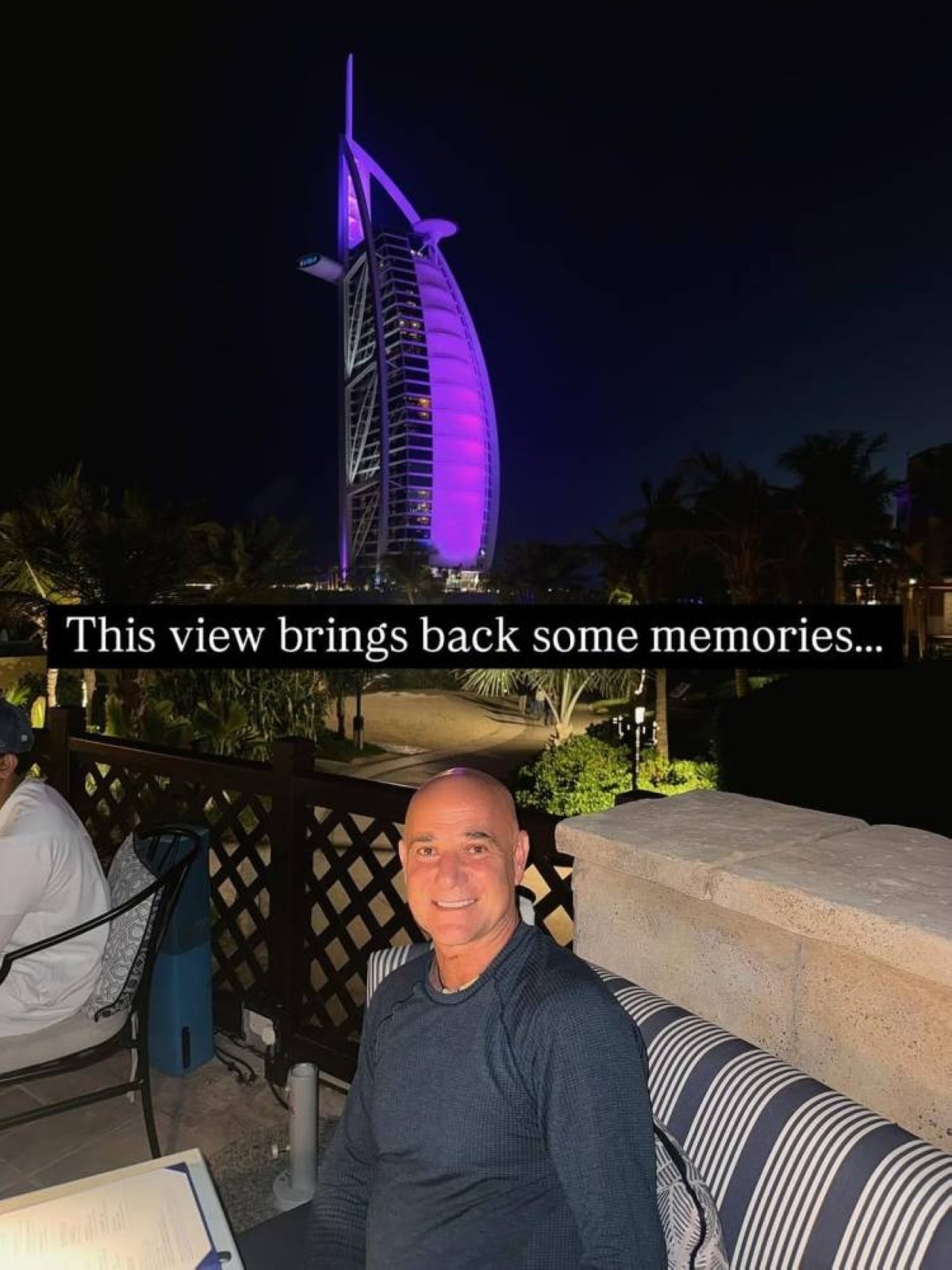 وخلال زيارة حالية إلى دبي، نشر أغاسي صوراً له وهو يجلس قبالة برج العرب، مرفقاً إياها بتعليق قال فيه: «هذا المشهد يعيد بعض الذكريات»، قبل أن يضيف في تعليق آخر: «Very special court» (ملعب مميز للغاية).