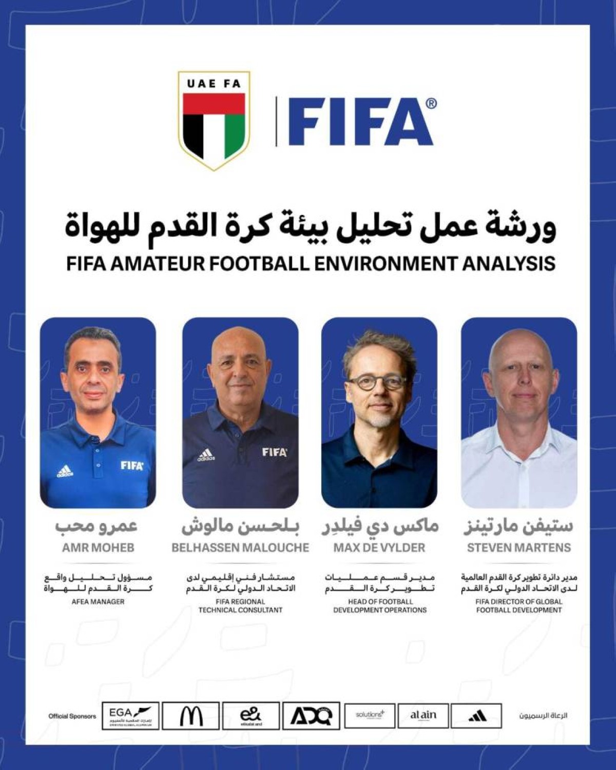 يستضيف اتحاد الإمارات لكرة القدم، بالتعاون مع الاتحاد الدولي لكرة القدم «فيفا»، يومي الثلاثاء والأربعاء، ملتقى «تحليل بيئة كرة القدم للهواة»، في إطار تعزيز الشراكة بين الجانبين ودعم جهود تطوير اللعبة على مستوى المنطقة. ويشارك في الملتقى عدد من خبراء «فيفا»، بينهم ماكس دي فيلدر، مدير قسم عمليات تطوير كرة القدم، والدكتور بلحسن مالوش، المستشار الفني الإقليمي، وعمرو محب، مسؤول تحليل واقع كرة القدم للهواة في الاتحاد الدولي.