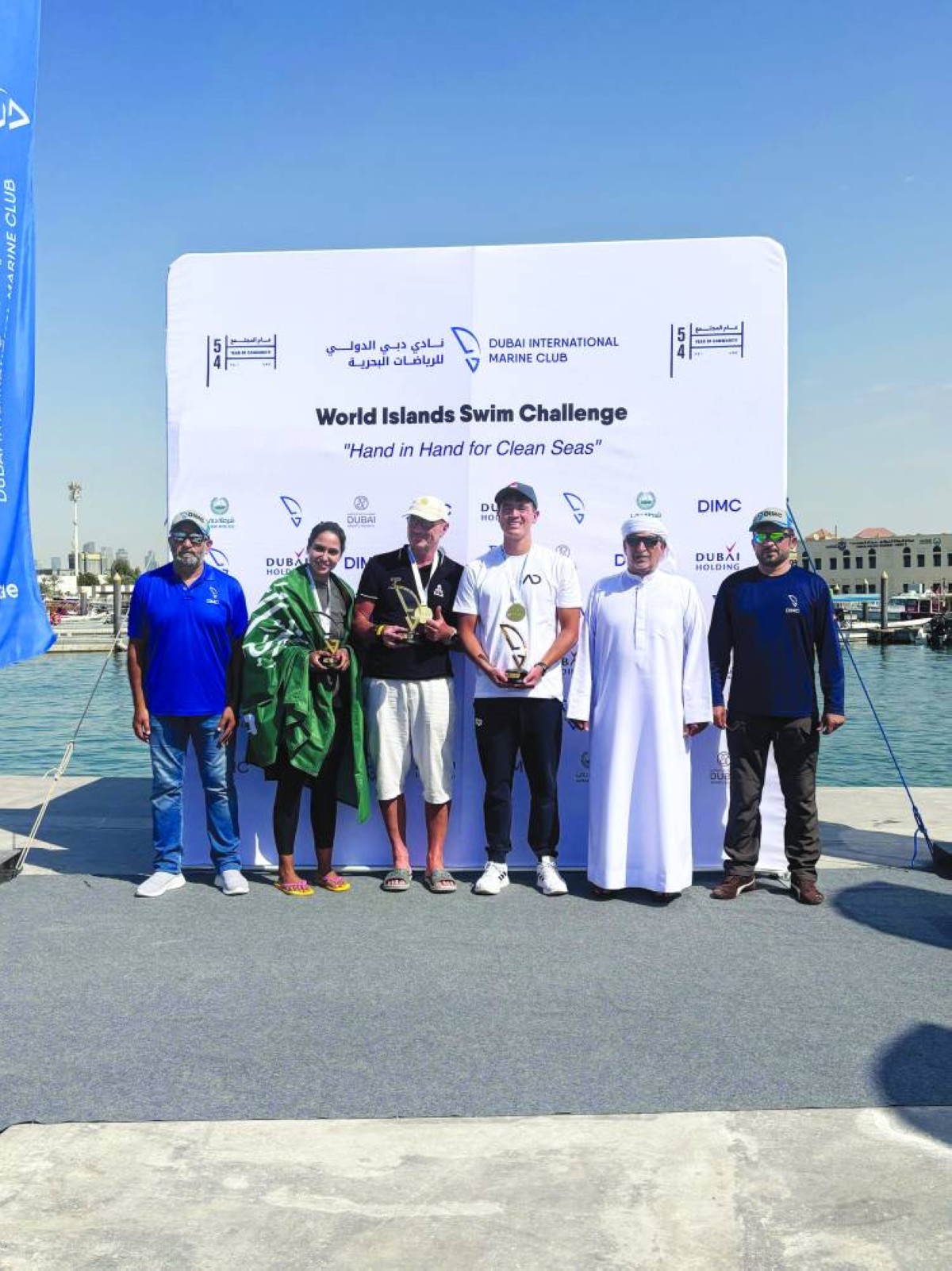 وعقب نهاية الفعالية قام محمد سيف المري، مدير الإدارة الرياضية وشؤون المتسابقين في نادي دبي الدولي للرياضات البحرية، يرافقه أحمد حسن السويدي، رئيس الحكام، بتقديم درع النادي والميدالية التذكارية للسباحة السعودية مريم، والسباح رونالدسون، والمدرب الأوكراني فلاديمير.