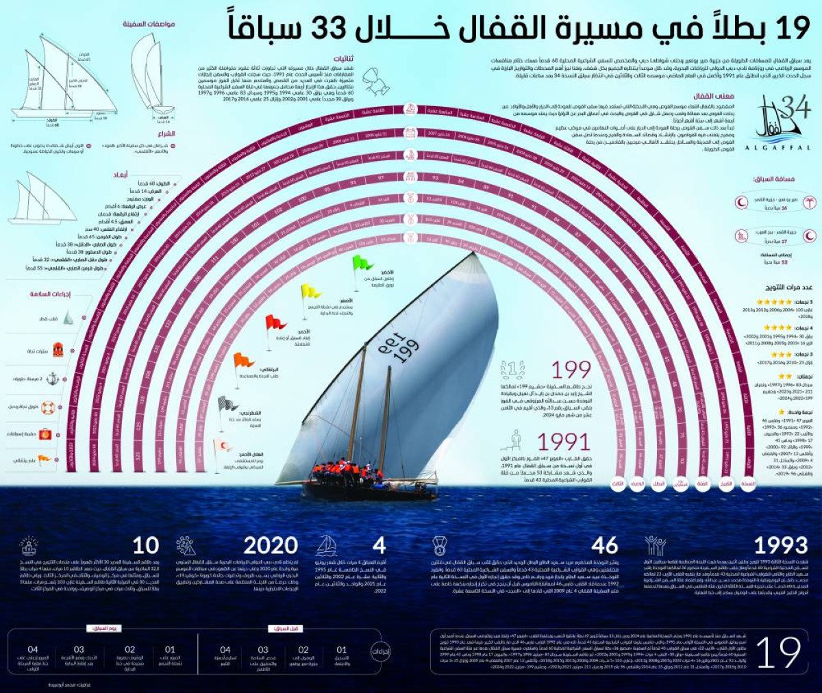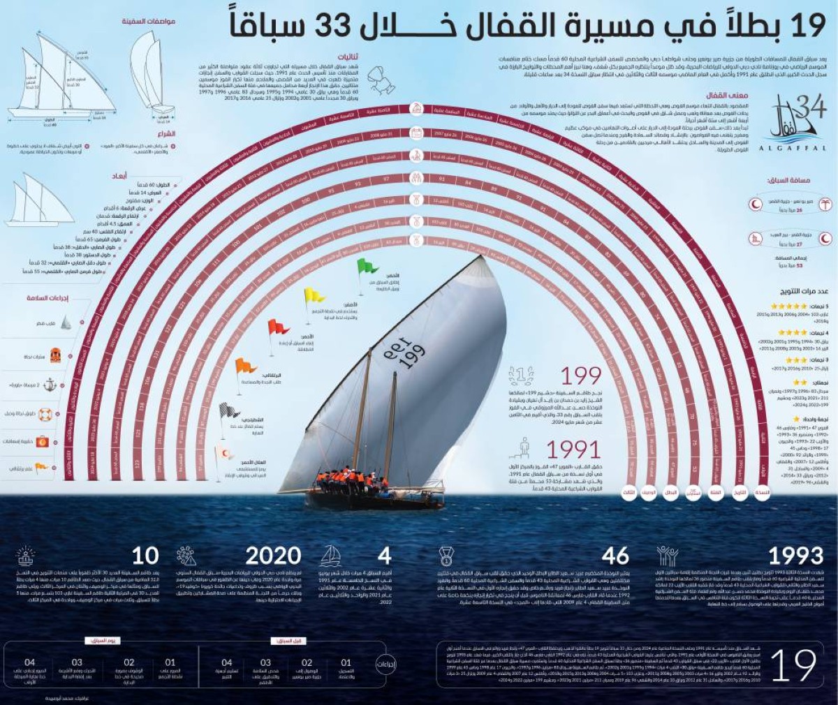 يعد سباق القفال للمسافات الطويلة من جزيرة صير بونعير وحتى شواطئ دبي والمخصص للسفن الشراعية المحلية 60 قدماً مسك ختام منافسات الموسم الرياضي في روزنامة نادي دبي الدولي للرياضات البحرية، وقد ظل موعداً ينتظره الجميع بكل شغف، وهنا نبرز أهم المحطات والتواريخ البارزة في سجل الحدث الكبير، الذي انطلق عام 1991 وأكمل في العام الماضي موسمه الثالث والثلاثين في انتظار سباق النسخة 34 بعد ساعات قليلة.