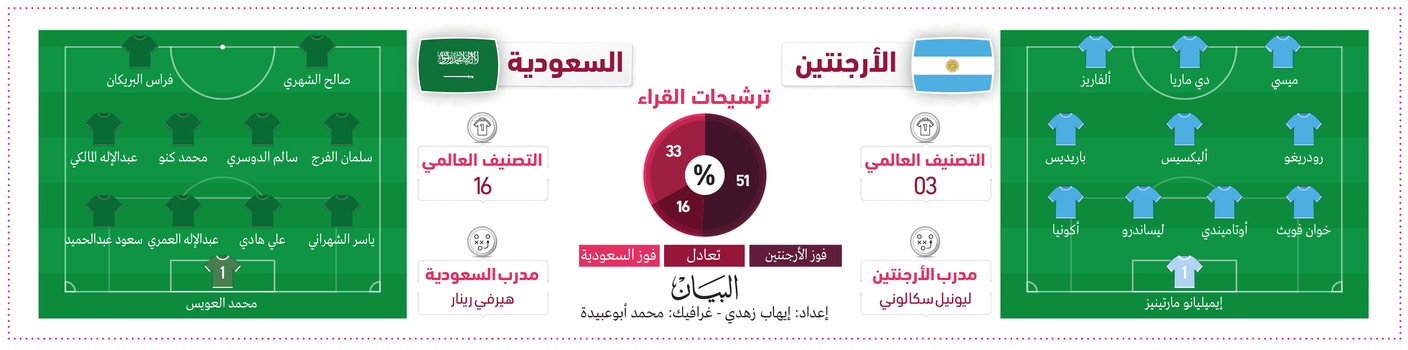 وينعم المنتخب السعودي الذي يضم 12 لاعباً من الهلال بطل آسيا، بالاستقرار الفني منذ تولي المدرب الفرنسي هيرفي رونار تدريبه في يوليو عام 2019، حيث نجح في قيادته إلى النهائيات للمرة السادسة في تاريخه بعد تصدره مجموعة ضمت اليابان وأستراليا. ويحلم المنتخب السعودي في تكرار حلم التأهل إلى الدور ثمن النهائي كما فعل في باكورة مشاركاته وتحديداً في مونديال الولايات المتحدة عام 1994 عندما سجل له نجمه سعيد العويران هدف الفوز التاريخي والرائع في مرمى بلجيكا، قبل أن يخسر الأخضر ضد السويد 1-3، يذكر أن الفريقين التقيا أربع مرات فازت الأرجنتين مرتين وتعادلا مرتين.