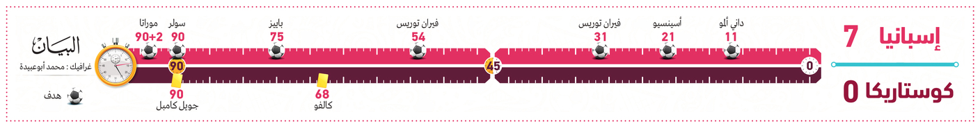 سحق المنتخب الإسباني نظيره الكوستاريكي بسباعية نظيفة، أمس، ضمن منافسات الجولة الأولى بالمجموعة الخامسة بكأس العالم لكرة القدم في قطر 2022. وسجل داني أولمو الهدف الأول للمنتخب الإسباني في الدقيقة 11، قبل أن يضيف ماركو أسينسيو الهدف الثاني في الدقيقة 21. وفي الدقيقة 31 سجل فيران توريس الهدف الثالث، قبل أن يضيف اللاعب ذاته الهدف الرابع في الدقيقة 54، ثم أضاف جافي الهدف الخامس بهدف في الدقيقة 75، ثم سجل كارلوس سولير الهدف السادس في الدقيقة 90، واختتم ألفارو موراتا سباعية فريقه في الدقيقة الثانية من الوقت المحتسب بدلاً من الضائع للشوط الثاني.وكانت مباريات الجولة الأولى بالمجموعة ذاتها، قد شهدت فوز اليابان على ألمانيا 2 /1، ويلتقي المنتخب الإسباني مع نظيره الألماني الأحد المقبل في الجولة الثانية، فيما تلعب اليابان مع كوستاريكا.