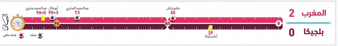 ووجّه البديل الآخر زكرياء أبو خلال، الضربة القاضية لبلجيكا، بتسجيله الهدف الثاني إثر تمريرة من زياش، تابعها بيمناه من مسافة قريبة، إلى يسار كورتوا (90 + 3).