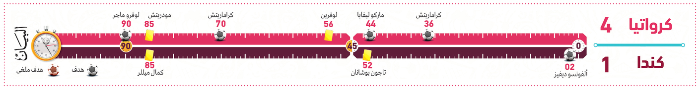 وتقدم المنتخب الكندي في الدقيقة الثانية عن طريق ألفونسو دايفز، قبل أن يدرك المنتخب الكرواتي التعادل عن طريق أندريه كاراماريتش في الدقيقة 36، ثم سجل ماركو ليفايا الهدف الثاني في الدقيقة 44.