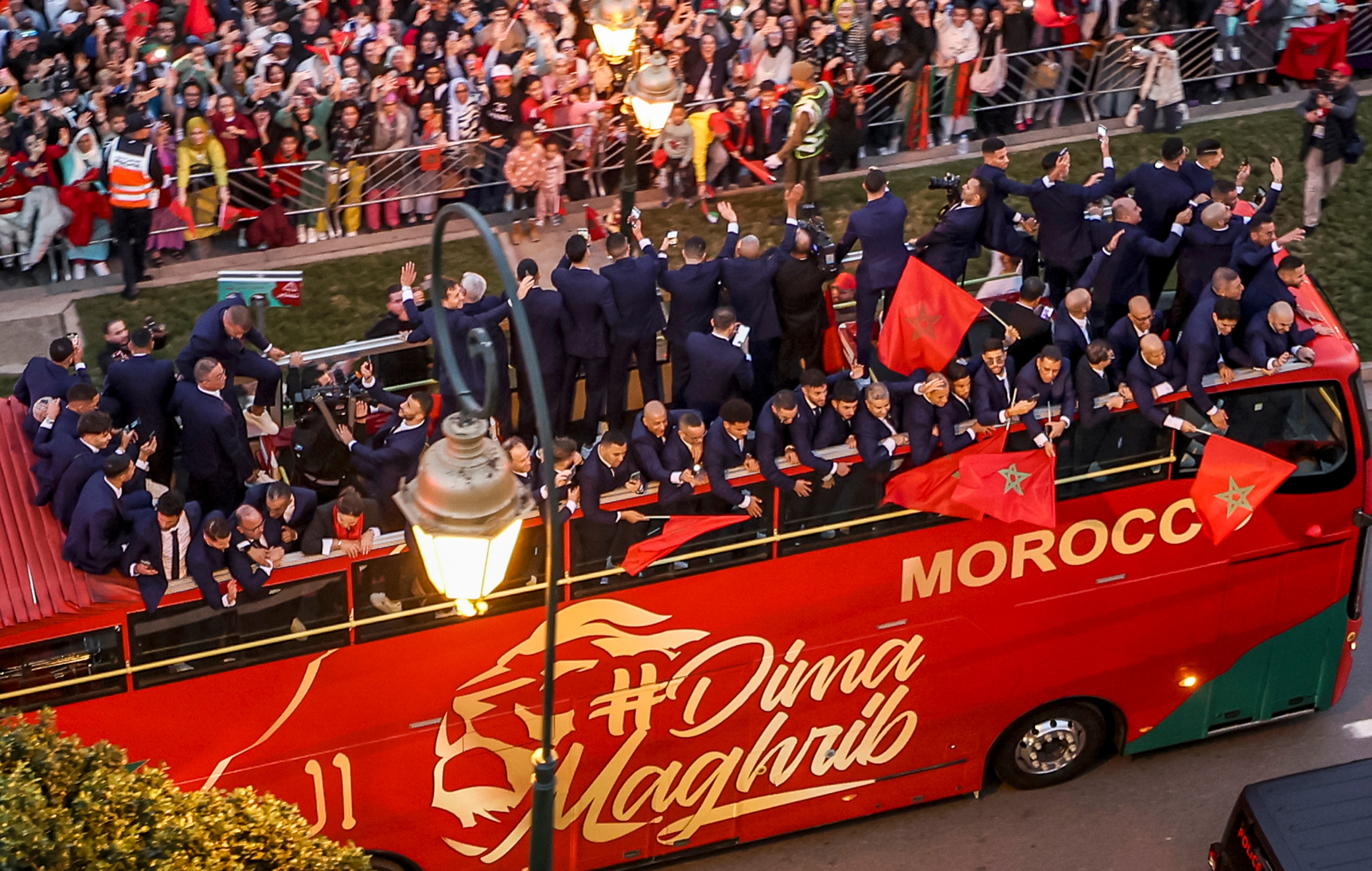 واحتشد آلاف المشجعين أمام مطار الرباط لدى وصول الفريق وفي أكبر شوارع العاصمة المغربية حيث هتف الجميع للفريق ونجومه ومدربه المحنك وليد الركراكي الذي قاد الفريق لهذا الإنجاز.