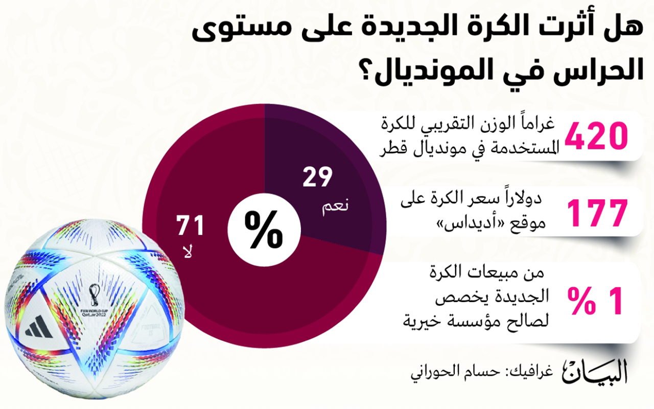 أكد 71 % مقابل 29 % من المشاركين في استطلاع «البيان» على «تويتر»، أن الكرة الجديدة المستخدمة في مباريات كأس العالم 2022 المعروفة باسم «الرحلة»، غير مؤثرة على أداء حراس المرمى، مع العلم أنها الكرة الـ 14 على التوالي التي تصنعها شركة «أديداس»، وتتسم بقدرتها على التنقل في الهواء أسرع من أي كرة أخرى، وتتميز بأعلى مستويات الدقة، بسبب وجود شريحة إلكترونية تساعد حكام المباراة.