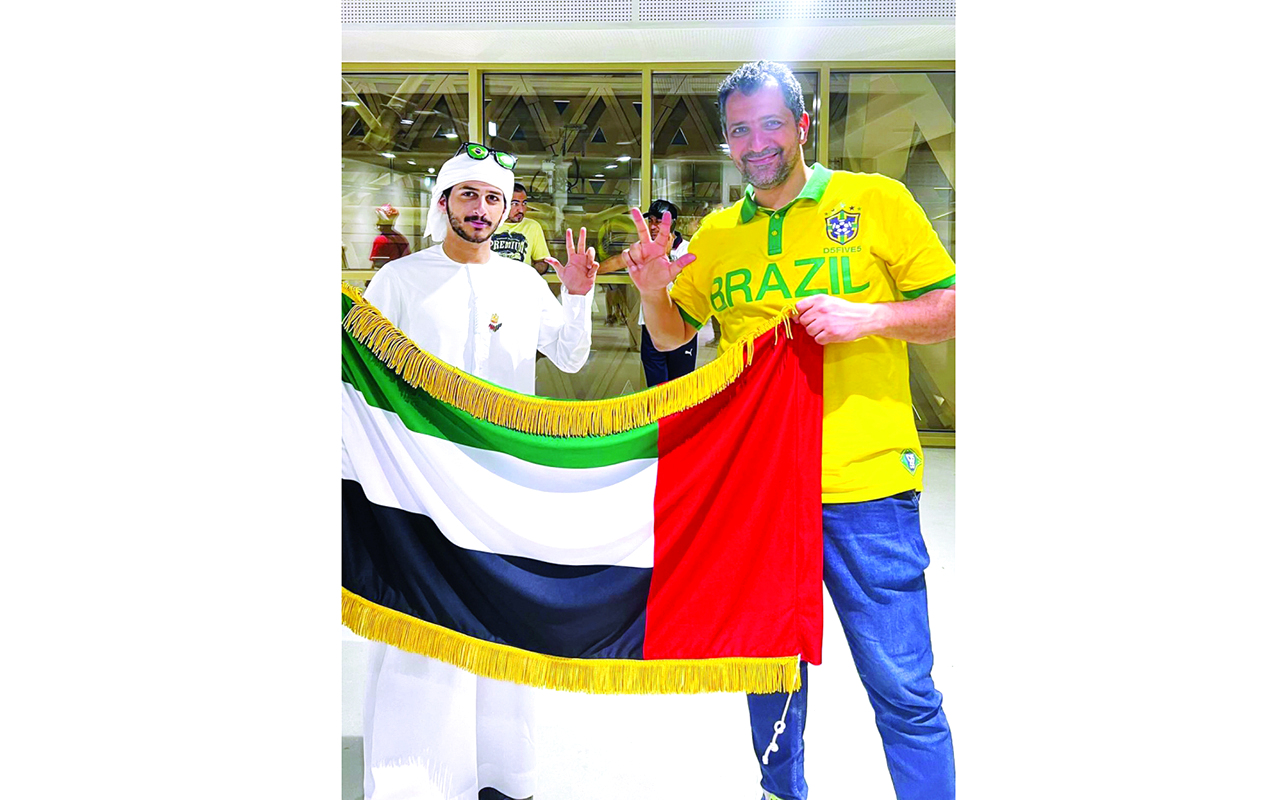«يا سما الأمجاد.. وأرض الاتحاد.. افرحي يا دار عيد.. الخير عاد.. دام عزك يا الإمارات.. روحنا فداك يا الإمارات»، بهذه الكلمات الجميلة، تغنّى المشجعون العرب، أول من أمس، أمام استاد لوسيل المونديالي في قطر، احتفالاً بعيد الاتحاد الـ 51 لدولة الإمارات العربية المتحدة. ولأنه مونديال كل العرب، فقد شارك الجمهور العربي من كل الجنسيات الشعب الإماراتي الفرحة الكبيرة بعيد الاتحاد، ليرفعوا أعلام الإمارات الغالية مع الصور التذكارية، كما وجهوا العديد من الرسائل للشعب والقيادة عبر «البيان».