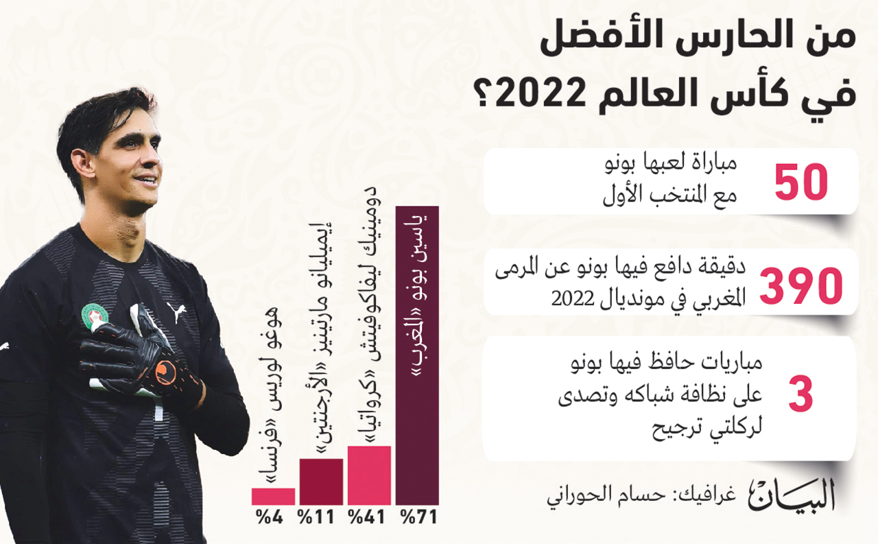 اختار 71 % من المشاركين في استطلاع «البيان» على «تويتر»، الحارس المغربي ياسين بونو، أفضل حارس مرمى في كأس العالم 2022، مؤكدين أنه يستحق جائزة «القفاز الذهبي»، وحصل ليفاكوفيتش حارس كرواتيا على نسبة 14 %، ومارتينيز حارس الأرجنتين على 11 %، وهوغو لوريس حارس فرنسا على 4 %.
