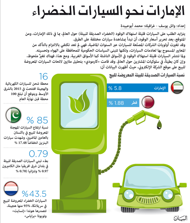 حتى الآن لم يكن كثيرون يفكرون بالسيارات الهجينة أو الكهربائية كخيار في المنطقة إجمالا، رغم أن دولا عربية غير منتجة للنفط مثل الأردن خطت خطوات واسعة في هذا المجال، وحتى في الإمارات فإن جهات حكومية كثيرة بدأت بالسير في هذا الطريق وإن بخطوات متواضعة، ويرى كثيرون أنه في جميع التجارب العالمية فإن الحكومات قبل الأفراد هي المطالبة بتبني هذا النهج البيئي، خصوصا أن قرار الأفراد بالتحول نحو السيارات الصديقة للبيئة يستدعي وجود بنية تحتية مناسبة، كما يتطلب في كثير من الأحيان دعما حكوميا للسيارات الصديقة للبيئة عبر ممارسات مثل الإعفاء من الضرائب أو بعض الرسوم مثل رسوم التسجيل أو حتى «سالك»، وهو ما سبق وأن تمت المطالبة به من قبل إحدى وكالات السيارات المحلية في الإمارات.