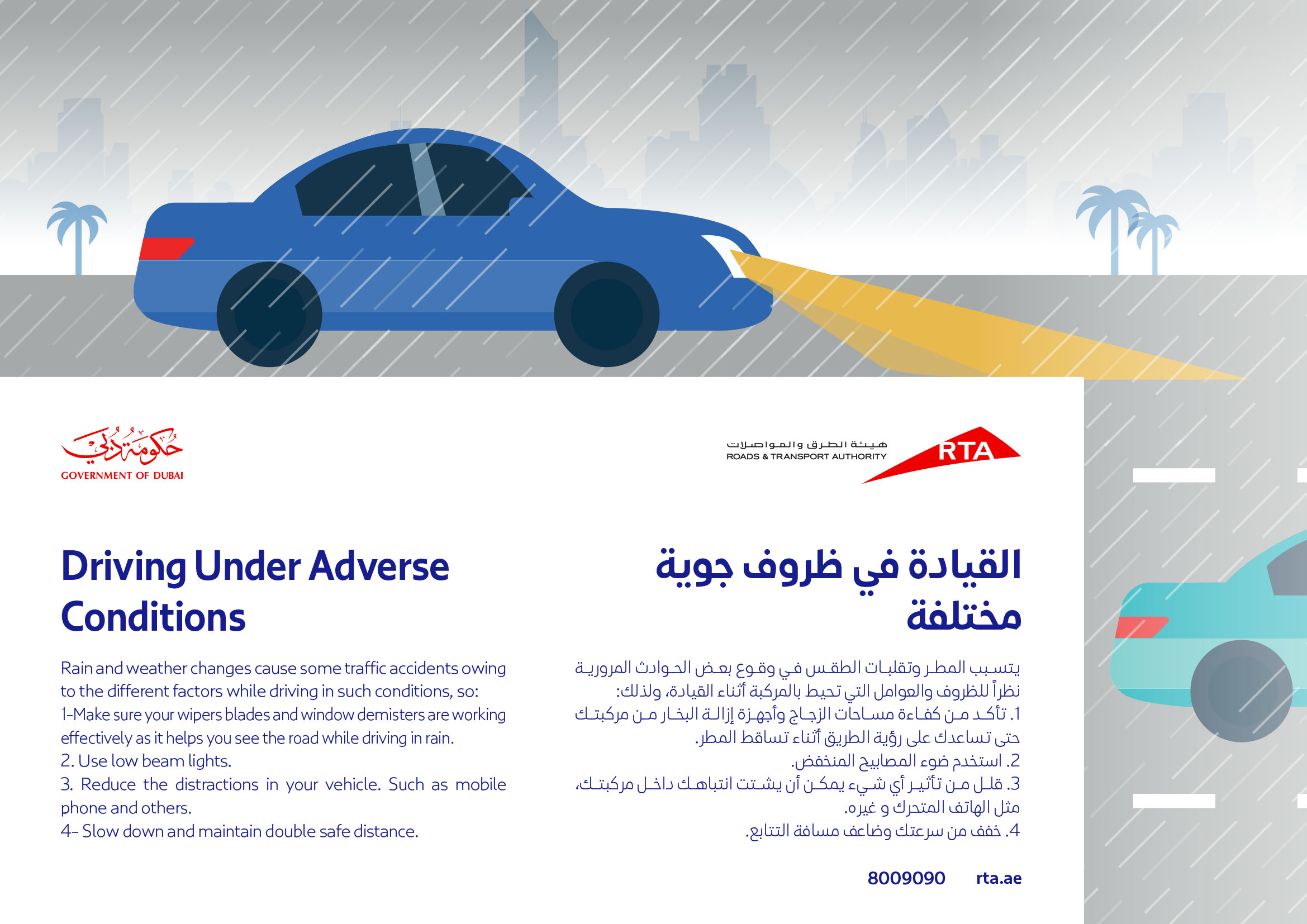 يتسبب المطر وتقلبات الطقس في وقوع بعض الحوادث المرورية نظراً للظروف والعوامل التي تحيط بالمركبة أثناء القيادة، ولذلك ينصح خبراء هيئة الطرق والمواصلات بدبي بمايلي :