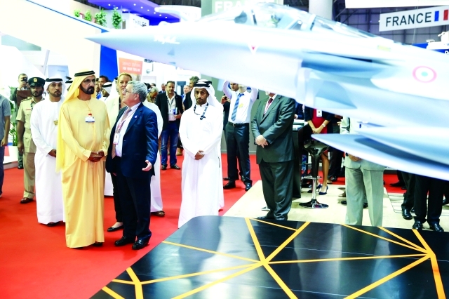 وانتقل صاحب السمو الشيخ محمد بن راشد آل مكتوم الى جناح الجمهورية الفرنسية ذات الباع الطويل في انتاج وتصنيع الطائرات العسكرية وأنظمتها الدفاعية والصواريخ المطورة، حيث اطلع سموه على مجسم الطائرة المقاتلة "رافال" واستمع الى شرح من مسؤولي الشركة المصنعة لهذه الطائرة الفريدة حول أنظمتها الإلكترونية الحديثة والصواريخ والمعدات العسكرية التي تستخدمها في حالات القتال.