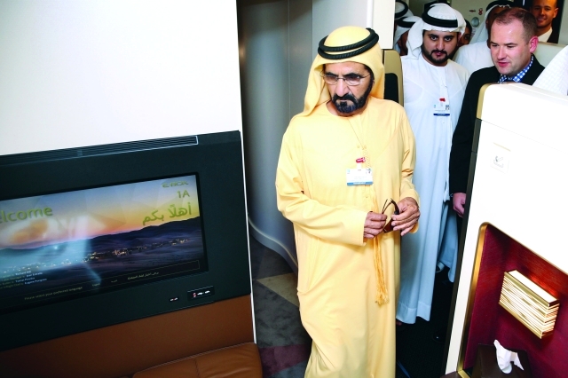 واختتم سموه جولته في المعرض بالصعود الى الطائرة الإيرباص A380 العملاقة التابعة لأسطول طيران الاتحاد الناقلة الوطنية بامتياز وتجول سموه في داخل الطائرة المتطورة من حيث أنظمتها ورفاهيتها وسعتها بحيث توفر أجواء مريحة وفارهة وآمنة للمسافرين على متنها. وأبدى سموه إعجابه بالأمان والرفاهية التي توفرها هذه السفينة الجوية لركابها.