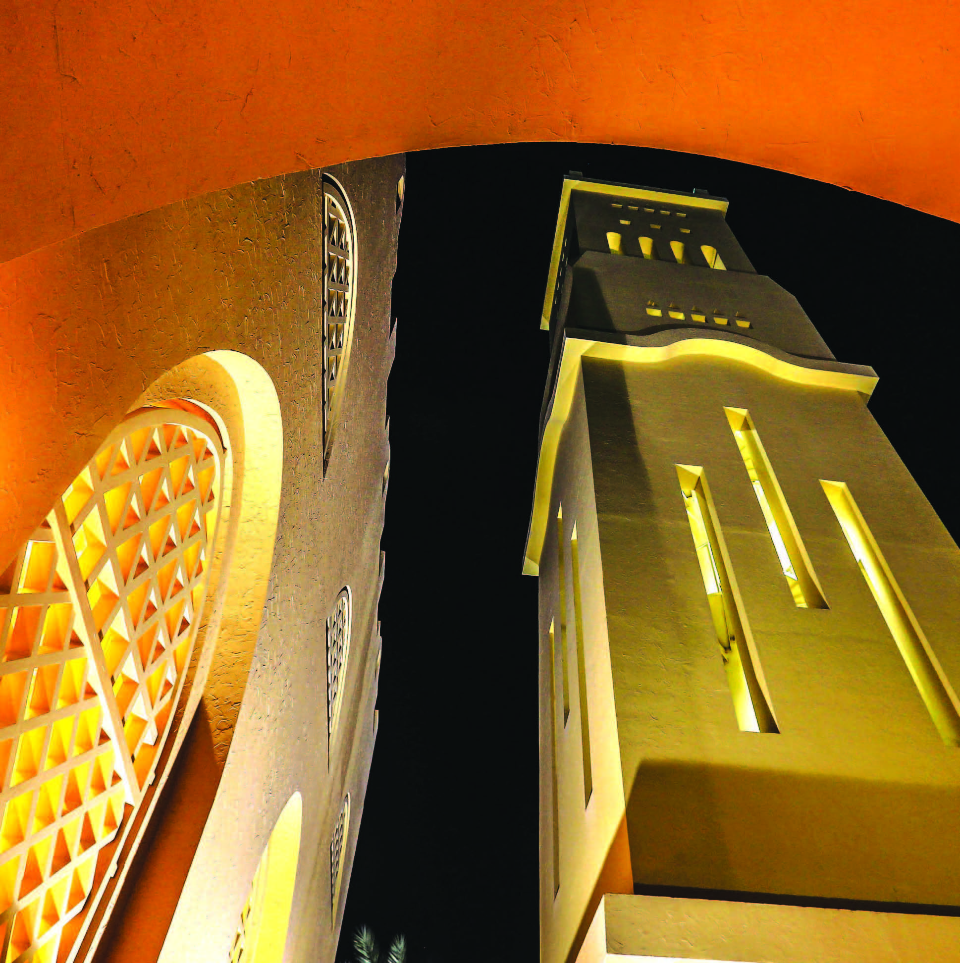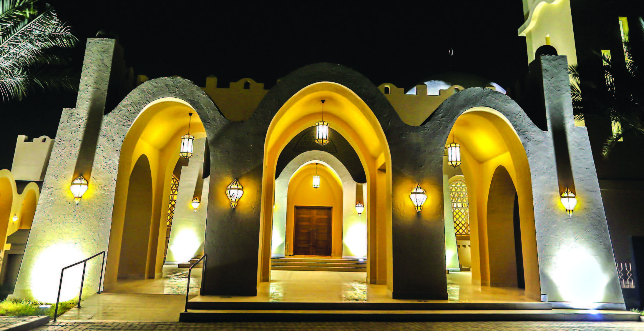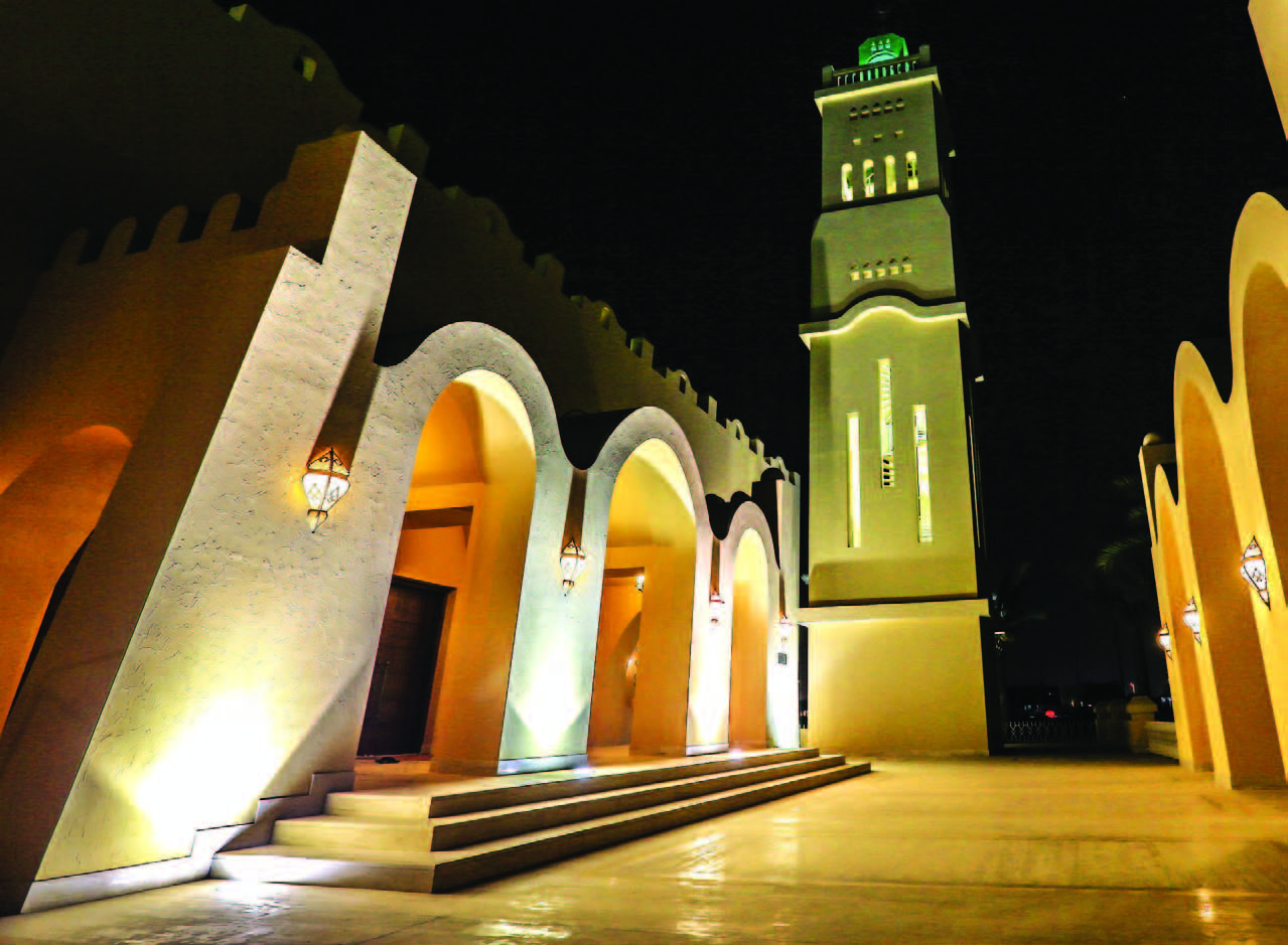شيد المسجد في منطقة خليفة (أ) على الطراز العربي القديم، ثلاث قناطر في مقدمة المبنى وقبة واحدة ومئذنة مربعة الشكل رفعت إلى أربعة طوابق تشع من نوافذها الجانبية إضاءة هادئة، والشكل العام للمسجد يوحي وكأنه من القلاع التاريخية.