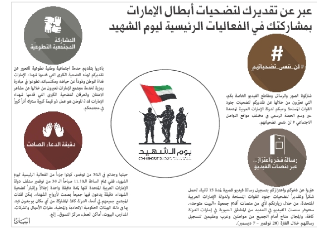 وسيتاح المجال أمام الجميع من مواطنين ومقيمين لتسجيل رسالة فيديو قصيرة لمدة 15 ثانية، تحمل رسالة شكر وتقدير لتضحيات الشهداء ولدولة الإمارات العربية المتحدة، وذلك في الفترة ما بين 28 نوفمبر و7 ديسمبر.
