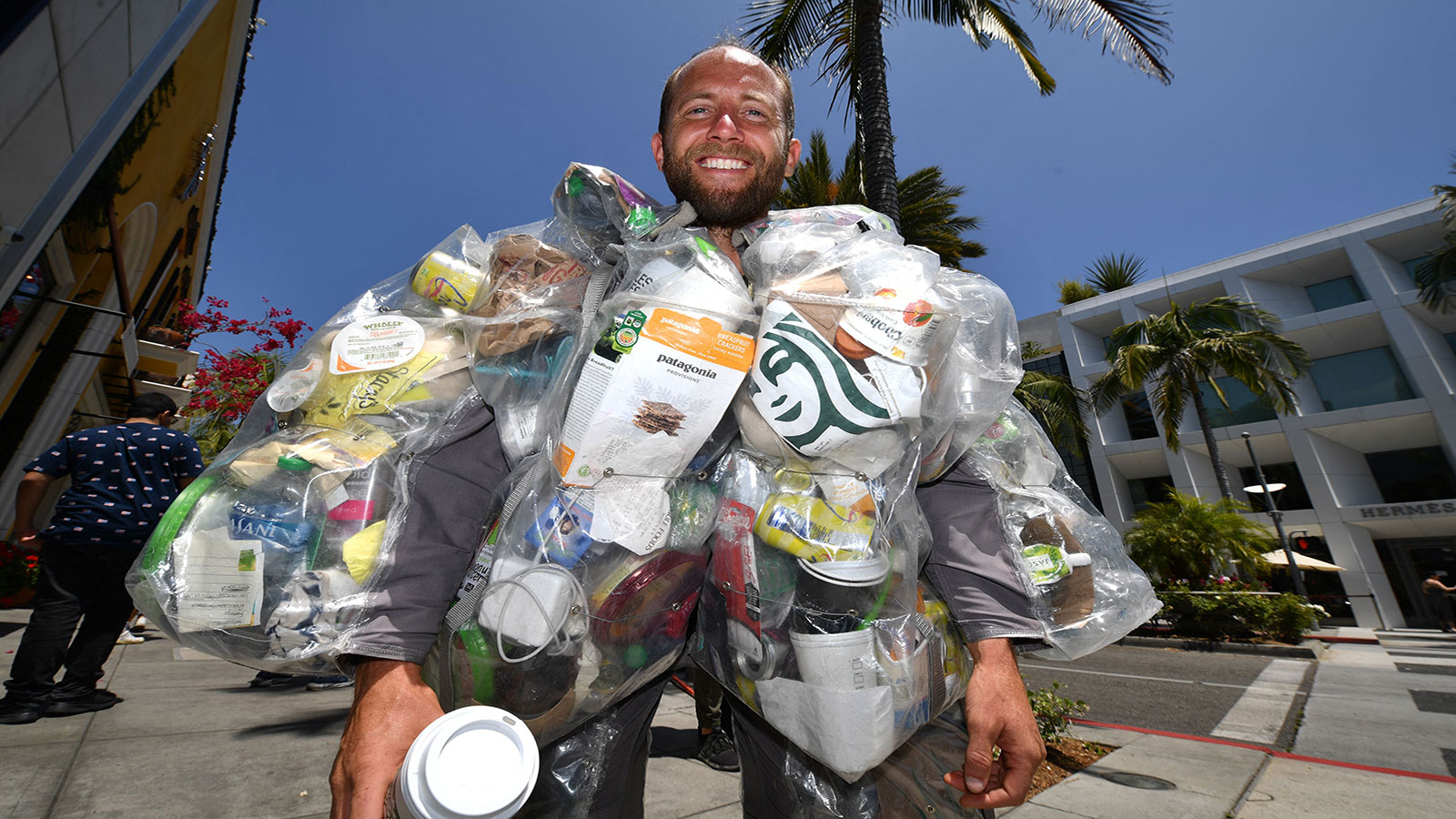 وفي إطار التحدي الذي يخوضه، قرر أن يرتدي كل النفايات التي ولّدها على مدار شهر كامل ويجوب بها شوارع لوس أنجليس لزيادة الوعي لدى الأشخاص الذين يقابلونه.