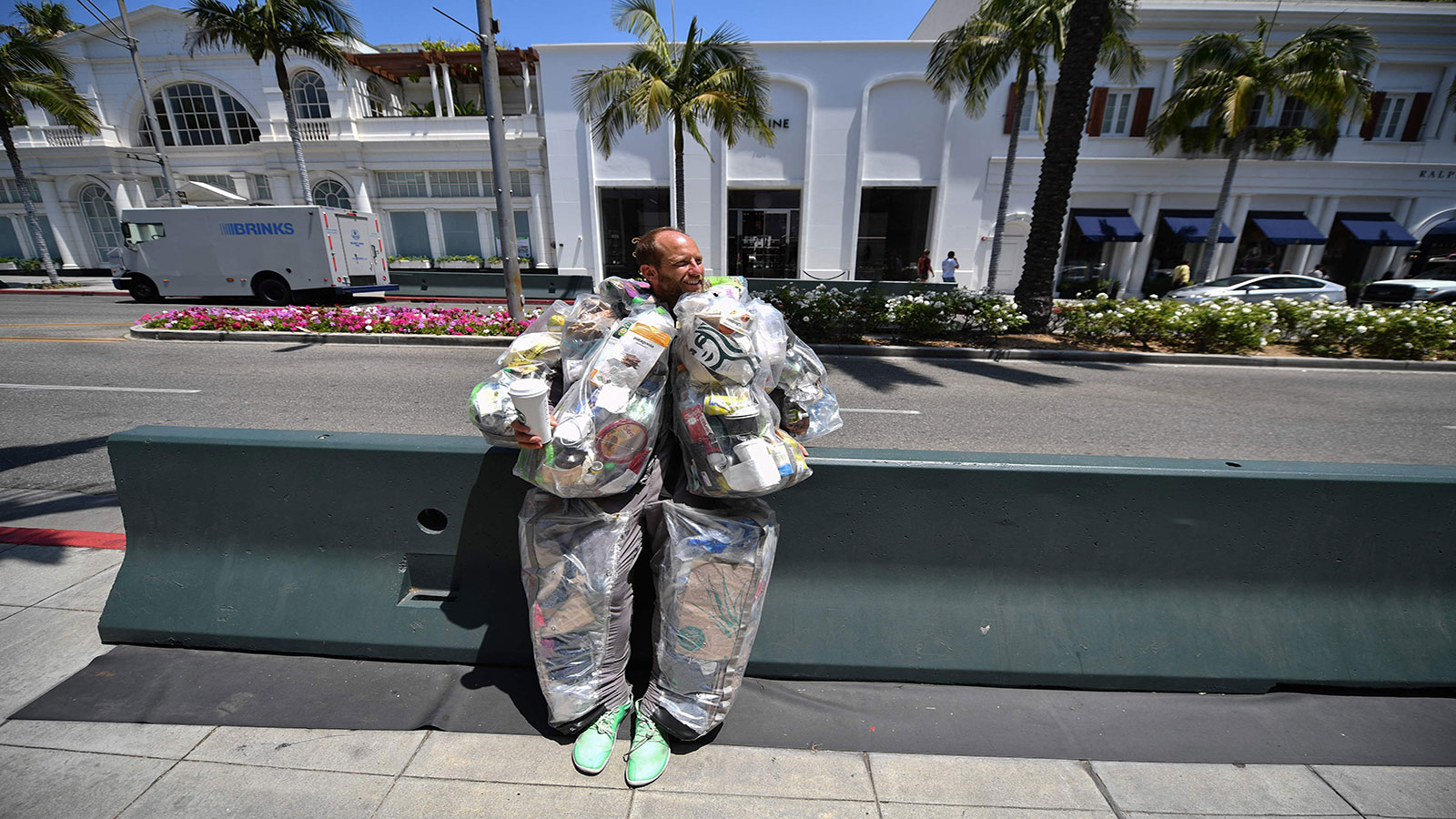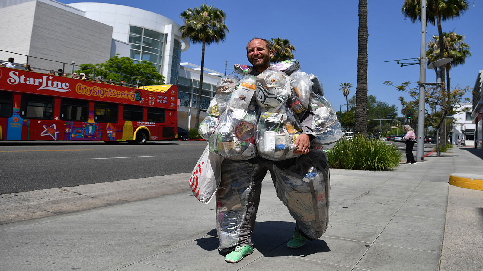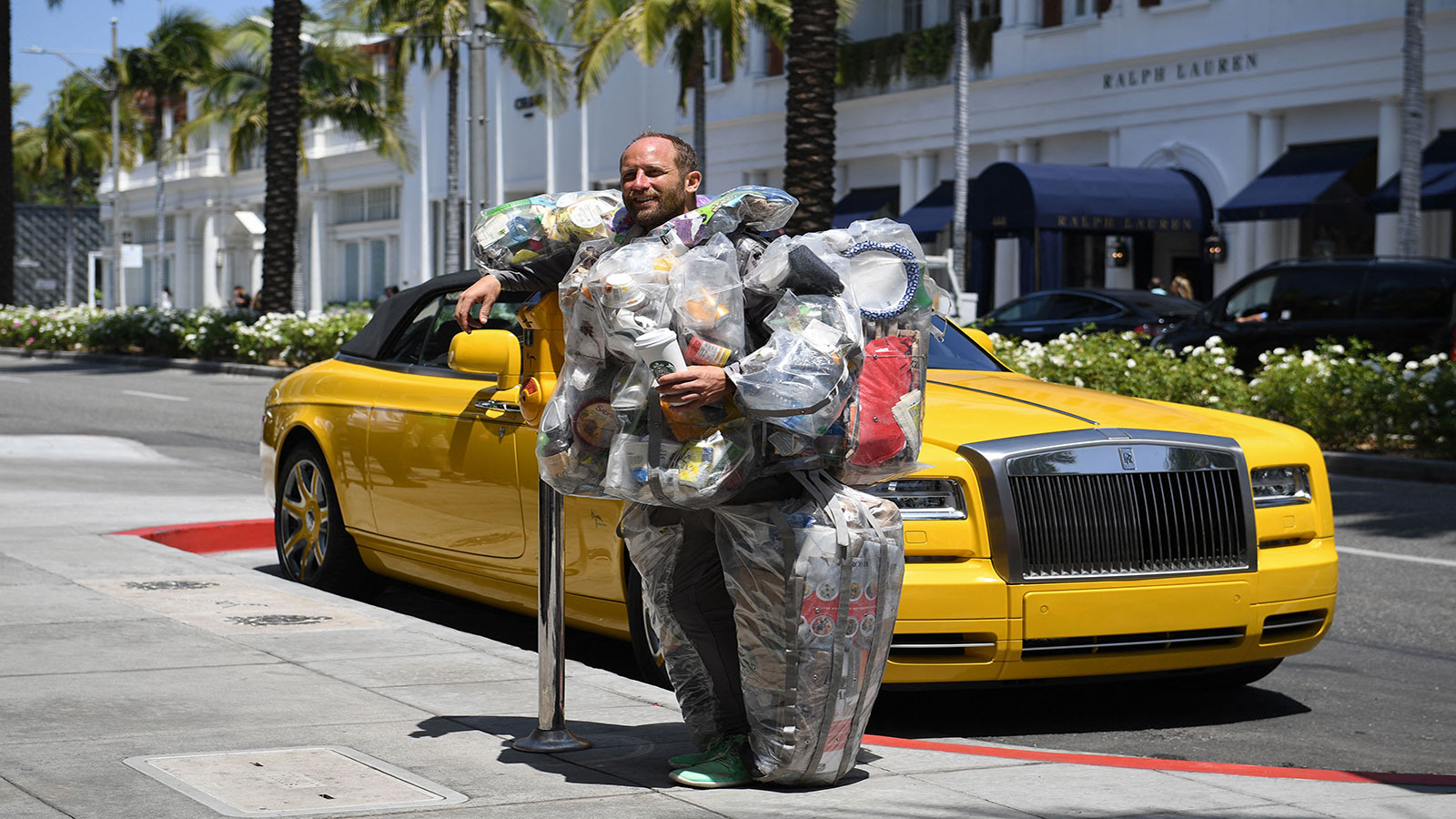 يجوب روب غرينفيلد شوارع منطقة بيفرلي هيلز الأمريكية الراقية واضعا على جسمه نحو ثلاثين كيلوغراماً من النفايات ثبّتها على زيّه المصنوع من مادة البلاستيك الشفافة منذ أن باشر مشروعه التثقيفي.