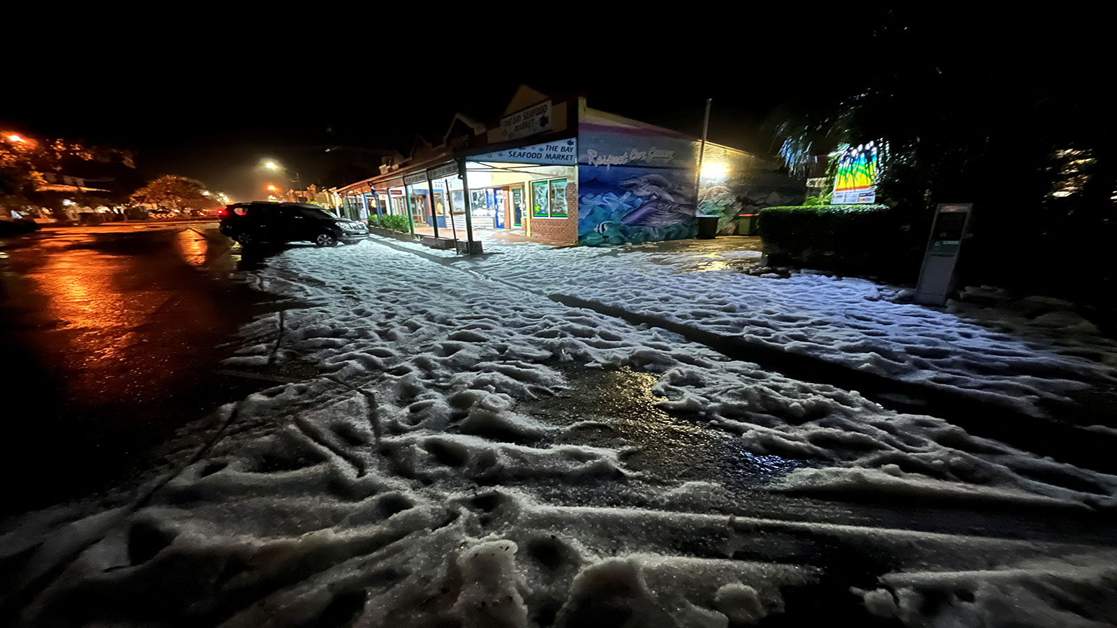 وغطى حوالي 10 سم من البرد منطقة الأعمال المركزية في خليج بايرون وجليد أبيض شبيه بالثلج بعد اصطدام عاصفة ناجمة عن حوض دافئ فوق كوينزلاند بكتلة من الهواء البارد متجهة شمالاً، وفق موقع "أستراليا بالعربي".