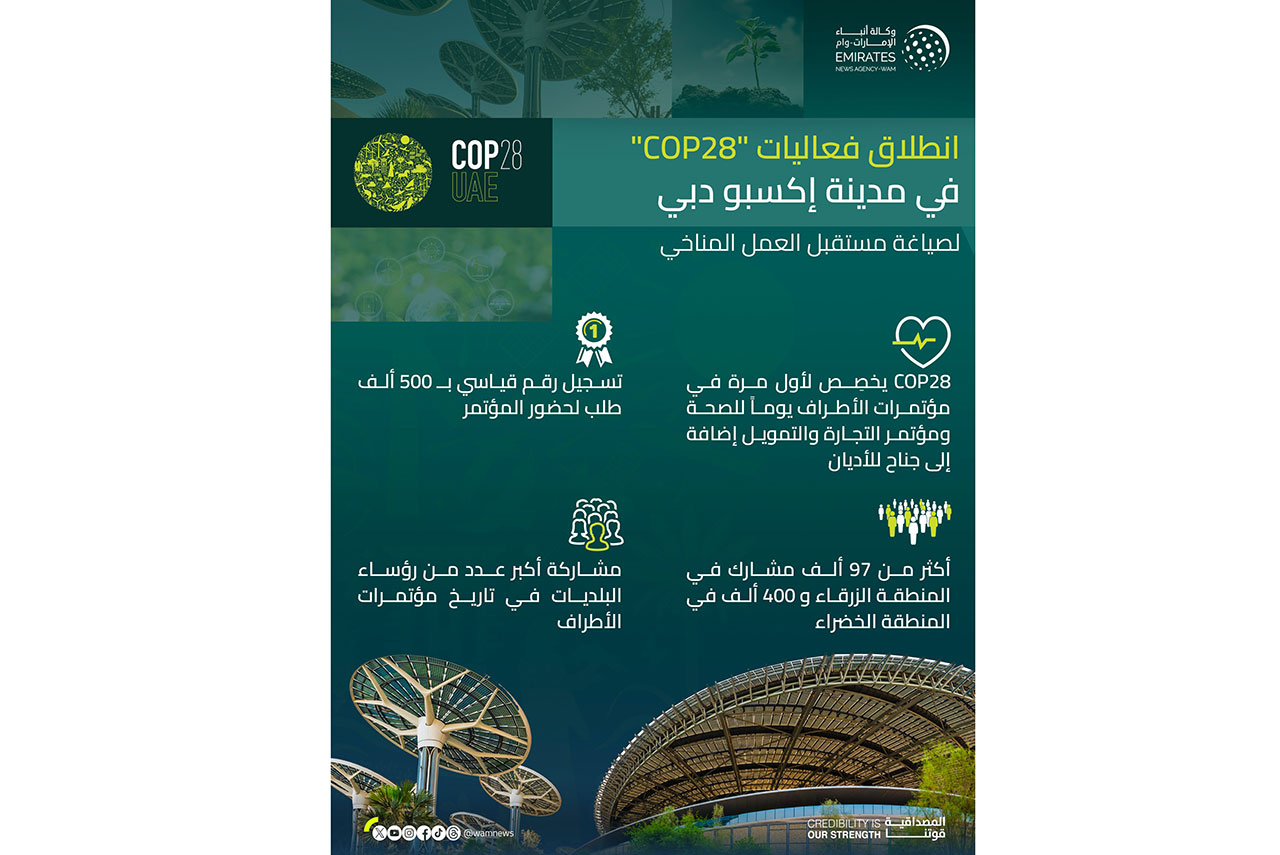انطلقت اليوم في مدينة إكسبو دبي فعاليات النسخة الثامنة والعشرين من مؤتمر الأطراف في اتفاقية الأمم المتحدة الإطارية بشأن تغير المناخ "COP28" و التي تستمر حتى 12 ديسمبر المقبل .