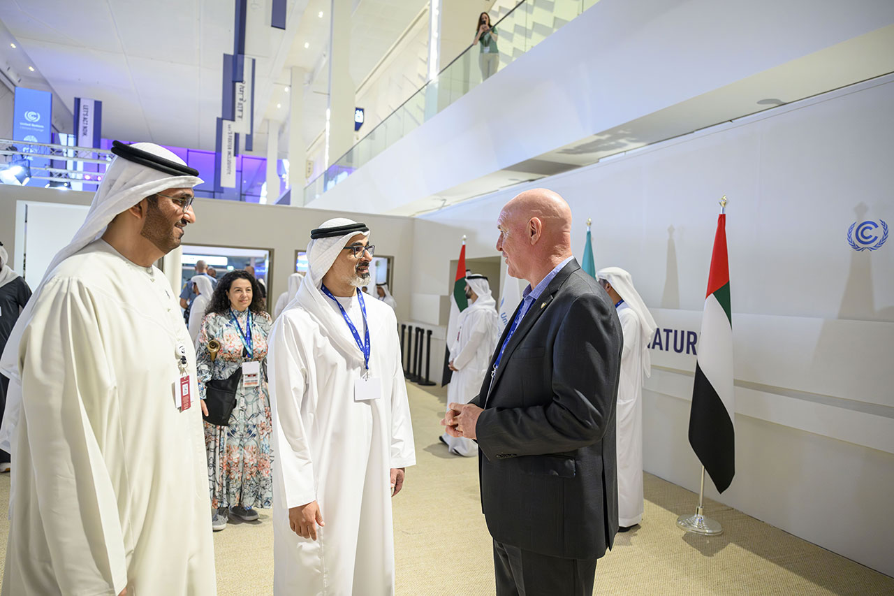 وأكَّد سموّه جاهزية دولة الإمارات العربية المتحدة لاستقبال ضيوفها، والعمل مع شركائها الدوليين لتعزيز التحوُّل العالمي إلى مصادر الطاقة النظيفة، وخفض الانبعاثات الكربونية لتحقيق أهداف اتفاق باريس للمناخ، مشيرا إلى أنَّ استضافة الدولة هذا الحدث الذي يجمع قادة السياسة والأعمال، والمنظمات غير الحكومية، والخبراء تُسهم في عملية صُنع السياسات التي تدعم تحقيق أهداف الاستدامة وتدفع النمو الاقتصادي المستدام، ما يتماشى مع رؤية عام الاستدامة في دولة الإمارات.