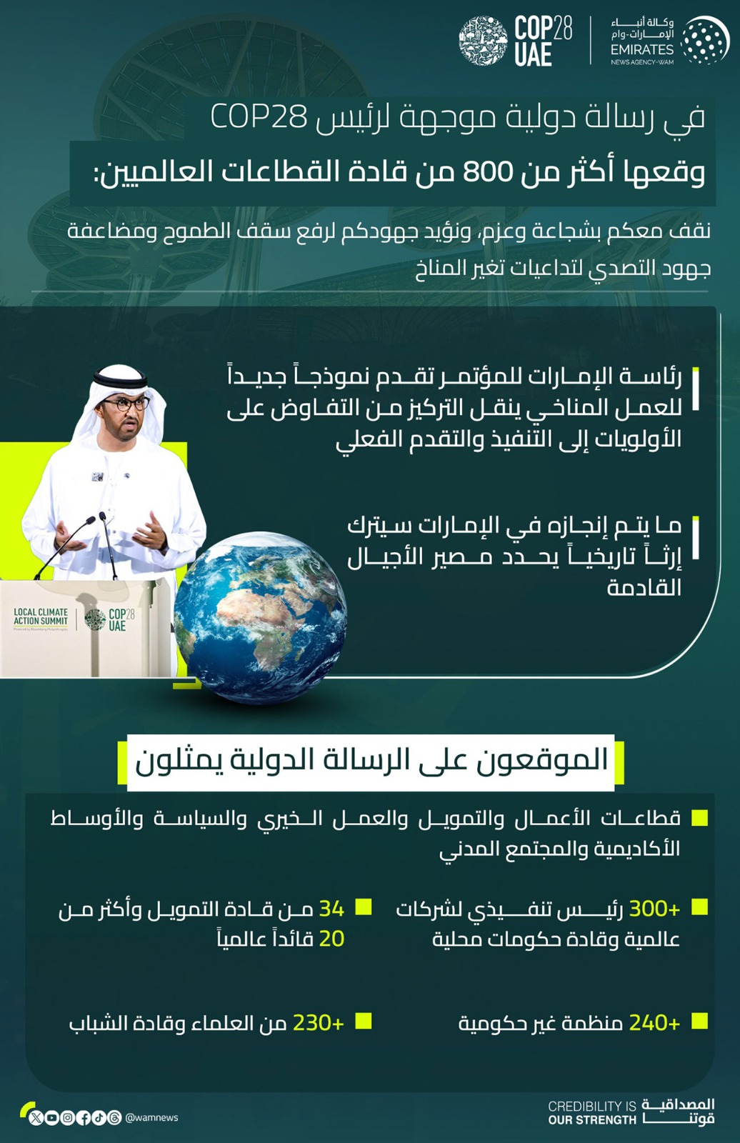 وأكد الموقعون أن رئاسة الإمارات للمؤتمر تقدم نموذجاً جديداً للعمل المناخي ينقل التركيز من التفاوض على الأولويات إلى التنفيذ والتقدم الفعلي، وأن حنكة الرئاسة لها دور كبير في تقدم المفاوضات وأعمال المؤتمر.