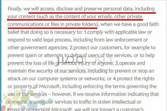 حيث احتوت الاتفاقية المبرمة بين المستخدمين والشركة على نحو 12 ألف كلمة، من بينها عبارات تحمل انتهاكا واضحا للخصوصية، والتي توضح مايكروسوفت أنها لأغراض متعلقة بحماية نفسها والمستخدمين، وتقديم خدمة أفضل لهم، لكن لا شيء هنا يضمن عدم استخدام البيانات الشخصية للمستخدم لغرض الدعاية والإعلان.