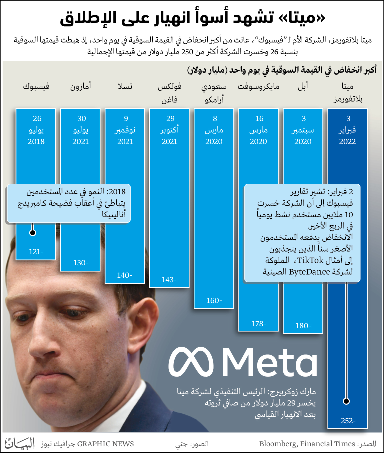وانخفض سهم ميتا 26 في المئة، مما أدى إلى محو أكثر من 200 مليار دولار في أكبر خفض على الإطلاق من القيمة السوقية لشركة أمريكية في يوم واحد. وأدى ذلك إلى خفض صافي ثروة مؤسسها ورئيسها التنفيذي زكربيرغ إلى 85 مليار دولار، وفقا لمجلة فوربس.