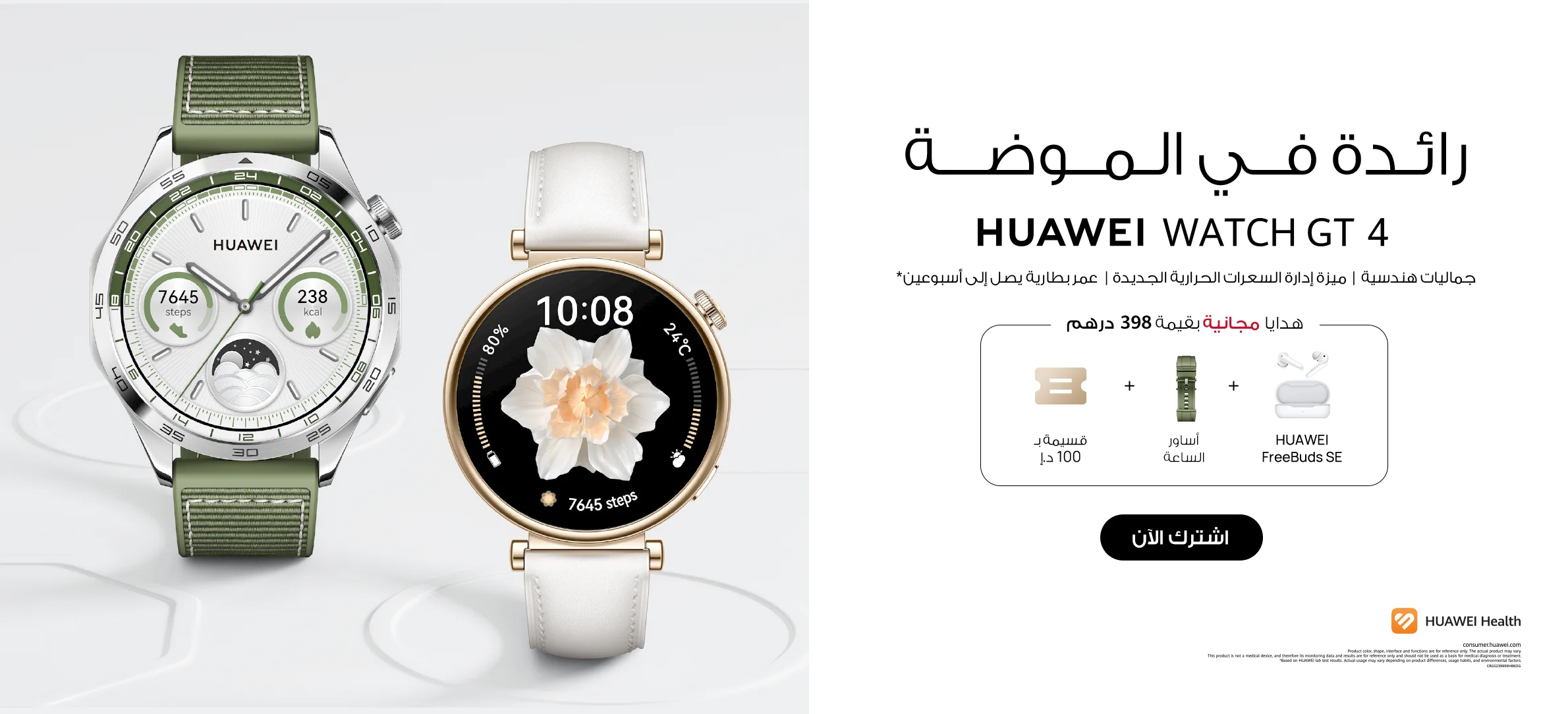 تعِد هواوي بكل هذا وأكثر في أحدث ساعاتها الذكية، HUAWEI WATCH GT 4. فهي الإضافة الغنيّة لأسلوب الموضة الخاص بك، وبها يمكن أن تكمل أناقتك في كل وقت ومناسبة، عوضًا عن أنها مساعدك الذكي الذي يتأكد من بقائك بصحة جيدة وحصولك على الكثير من الإنتاجية في يومك. لذا، إذا كنت تبحث عن ساعة ذكية هذا الموسم، فلا تنظر إلى أبعد من HUAWEI WATCH GT 4.