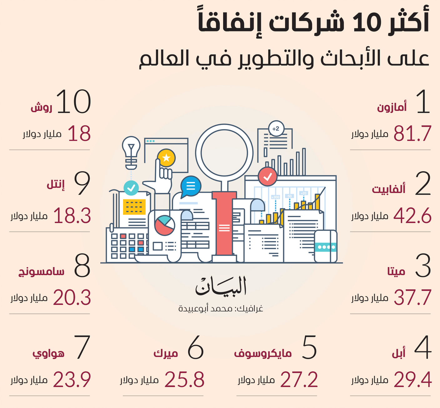 نشر حساب "المؤشر العالمي" المتخصص في نشر معلومات عن الإحصائيات العالمية في الاقتصاد والعلوم والتعليم والسفر والفنون والتكنولوجيا والديموغرافيا والجغرافيا والسياسة وغيرها قائمة بأكثر 10 شركات إنفاقاً على البحث والتطوير في العالم خلال آخر 12 شهرا.