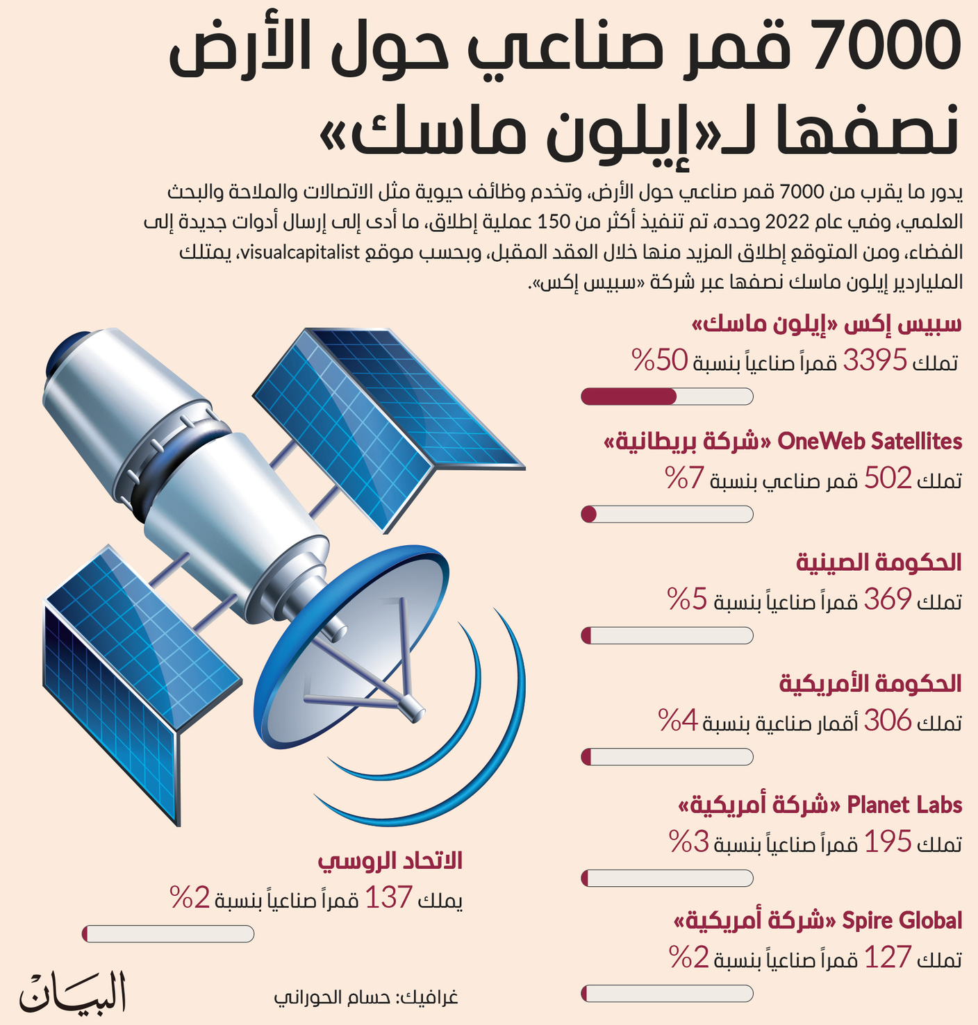 7000 قمر صناعي حول الأرض نصفها ل «إيلون ماسك» يدور ما يقرب من 7000 قمر صناعي حول الأرض، وتخدم وظائف حيوية مثل الاتصالات والملاحة والبحث العلمي وفي عام 2022 وحده، تم تنفيذ أكثر من 150 عملية إطلاق،