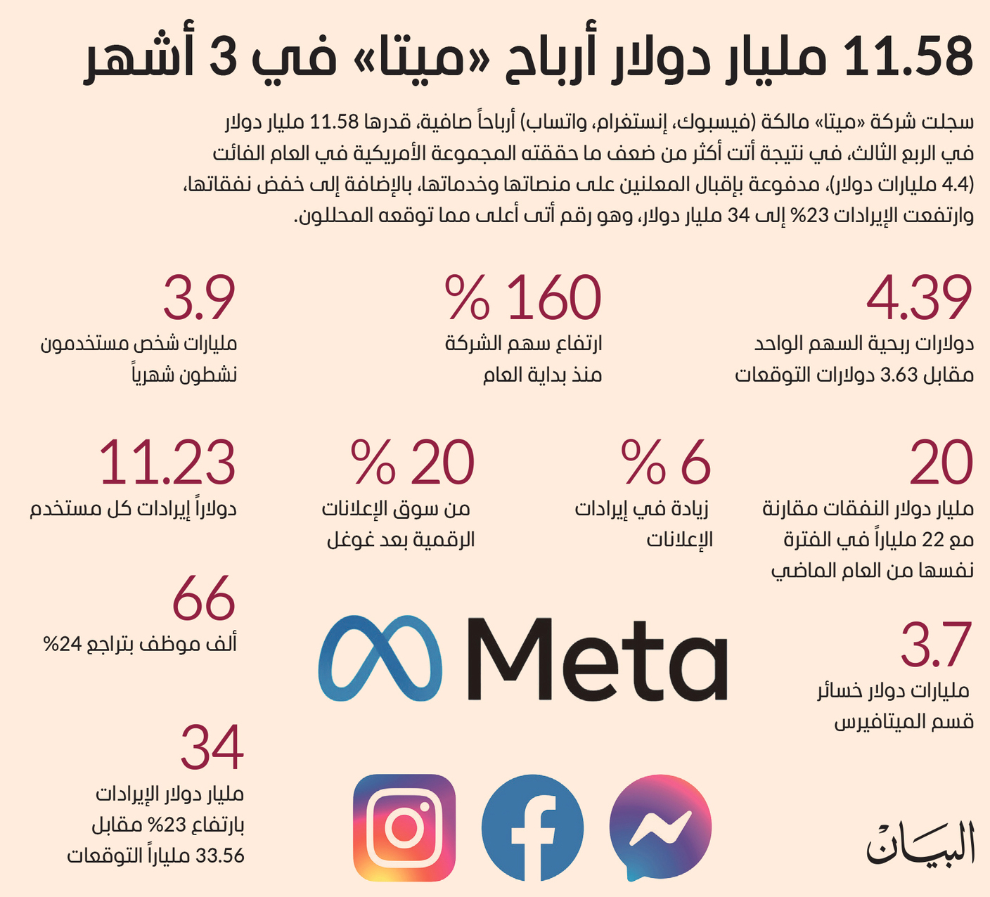 11.58 مليار دولار أرباح «ميتا» في 3 أشهر