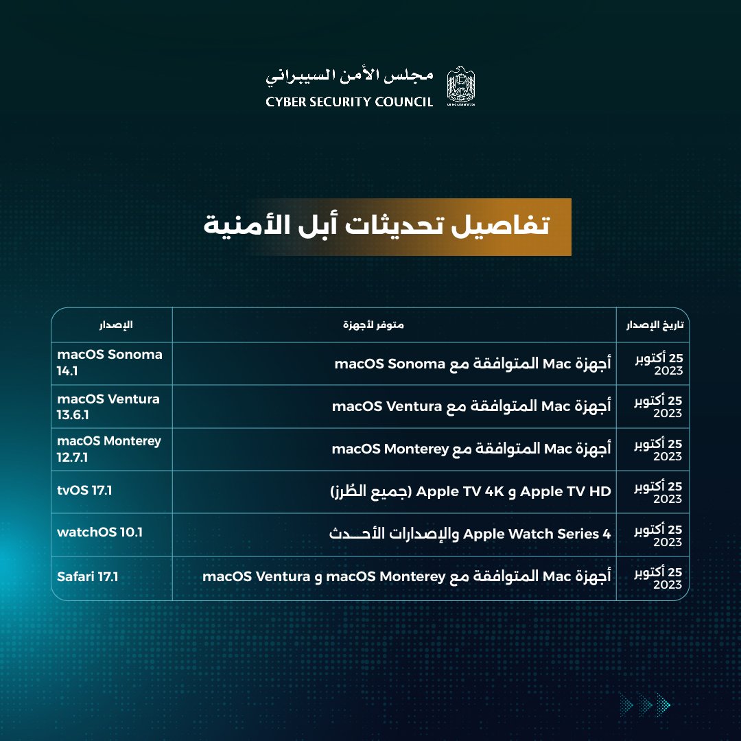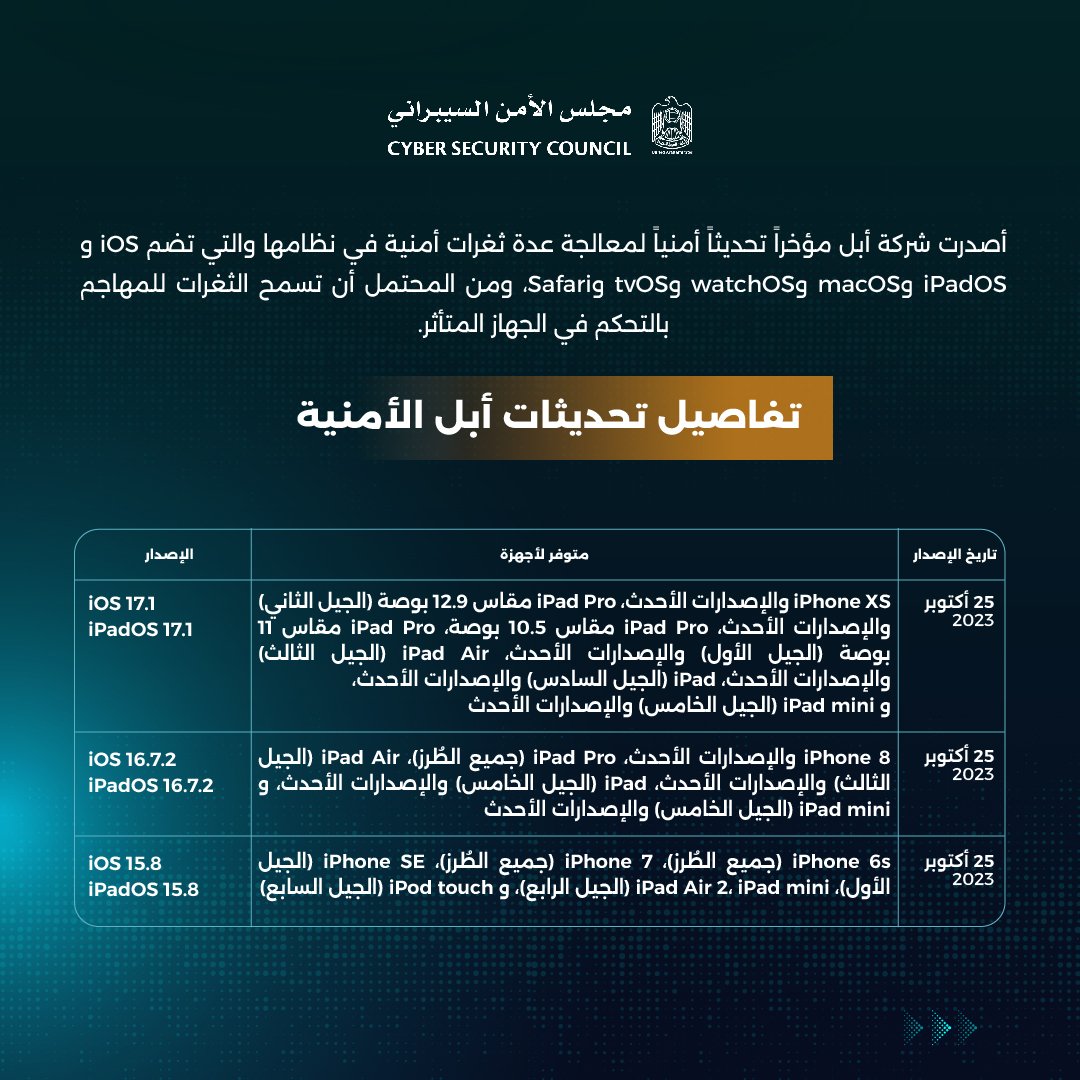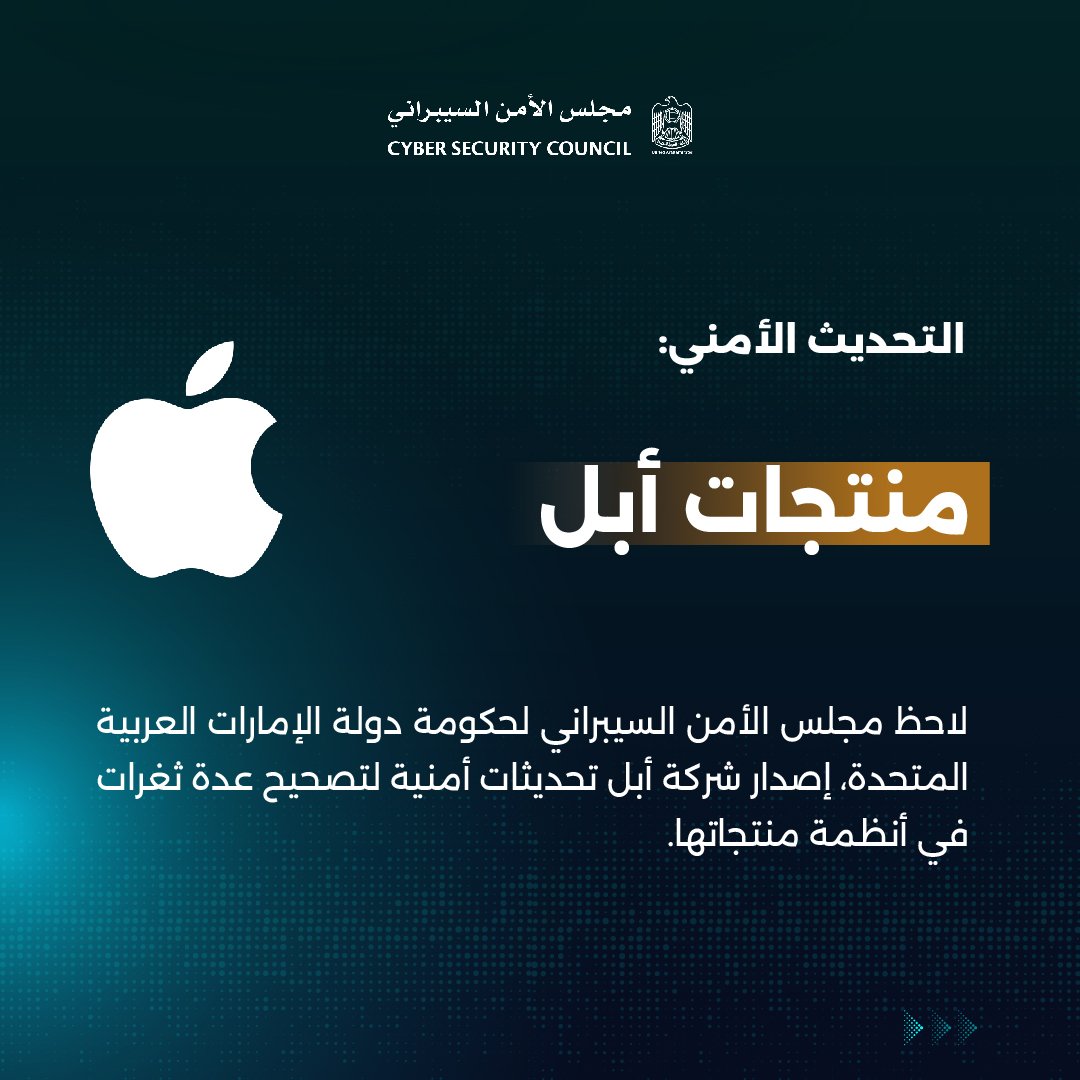 ودون المجلس في حسابه الرسمي عبر موقع التواصل الاجتماعي «إكس»، قائلاً: «نحذر من عدة ثغرات في أنظمة أبل (iOS وiPadOS وmacOS وwatchOS وtvOS وSafari)، والتي تسمح للمهاجم بالتحكم في أجهزتكم. نوصي جميع المستخدمين بالتحديث الفوري لأنظمتهم وبرامجهم لتجنب التهديدات المحتملة».