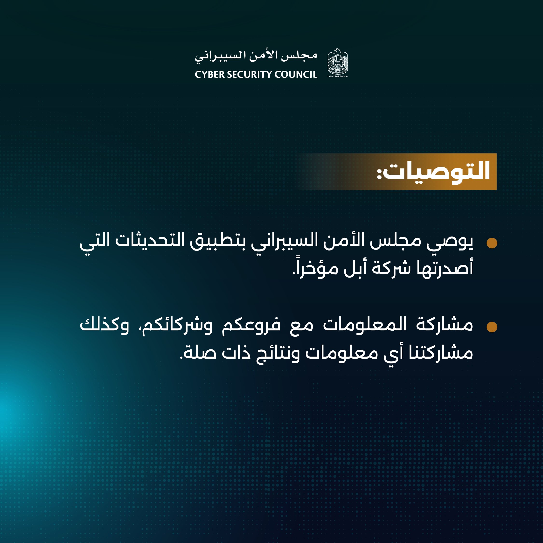 وطالب مجلس الأمن السيبراني مشاركة التحذير للجميع للتوعية من الثغرة، قائلاً: «شاركوا هذا التحذير مع أصدقائكم وعائلتكم لحماية أنفسكم ومجتمعكم الرقمي».