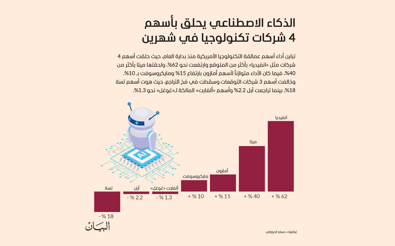 تباين أداء أسهم عمالقة التكنولوجيا الأمريكية منذ بداية العام، حيث حلقت أسهم 4 شركات مثل «انفيديا» بأكثر من المتوقع وارتفعت نحو 62%، ولحقتها ميتا بأكثر من 40%، فيما كان الأداء متوازناً لأسهم أمازون بارتفاع 15% ومايكروسوفت بـ 10%. فيما خالفت أسهم 3 شركات التوقعات وسقطت في فخ التراجع، حيث هوت أسهم تسلا 18%، بينما تراجعت أبل 2.2% وأسهم «ألفابت» المالكة لجوجل نحو 1.3%.