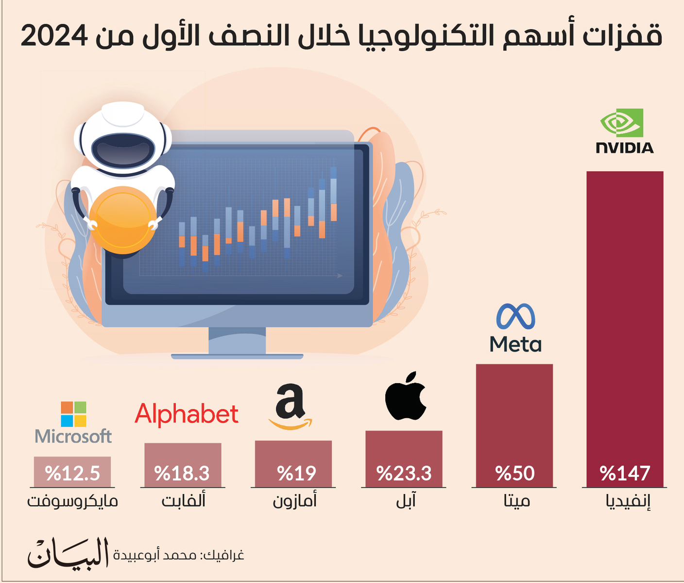 وتصدرت أسهم «إنفيديا» عمالقة التكنولوجيا من حيث المكاسب، بعد الارتفاعات القياسية، التي حققتها خلال النصف الأول، واستحوذ سهم الشركة على النصيب الأكبر من الارتفاعات منذ بداية العام، وقفز سهم أكبر شركة مصنعة لرقائق الذكاء الاصطناعي بنسبة 147%، بقيمة سوقية 2.93 تريليون دولار.